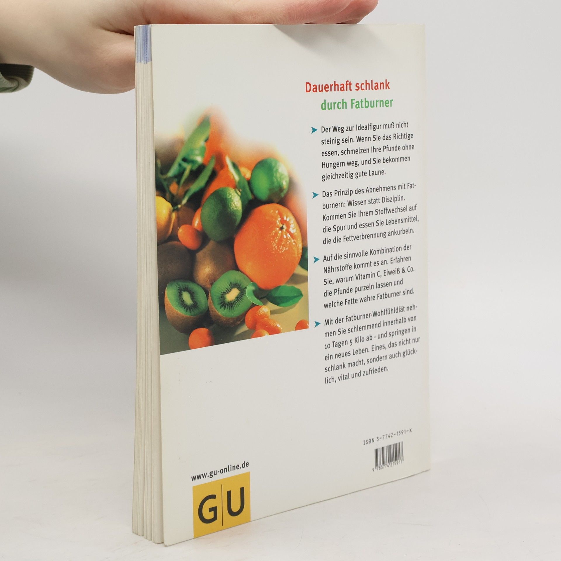 Abnehmen ohne Jo-Jo-Effekt. 'Fatburner' sind Vitalstoffe, die das Fett in den Zellen zum Schmelzen bringen: Sie aktivieren den Fettabbau in den Fettzellen oder kurbeln die Produktion von Hormonen an, die schlank, fit und glücklich machen. Der Ratgeber verrät, wie eine zeitgemäße Ernährung aussieht und in welchen Lebensmitteln welche Vitalstoffe stecken. Dazu gibt es eine komplette 14-Tage-Biostoff-Diät mit köstlichen und leichten Rezepten, die den Stoffwechsel auf Trab bringen und die Pfunde purzeln lassen, sowie ein ergänzendes Wellness-Programm mit Gymnastik, Massagen und vielem mehr. Als Extra ist eine Tabelle zum Einstecken enthalten.