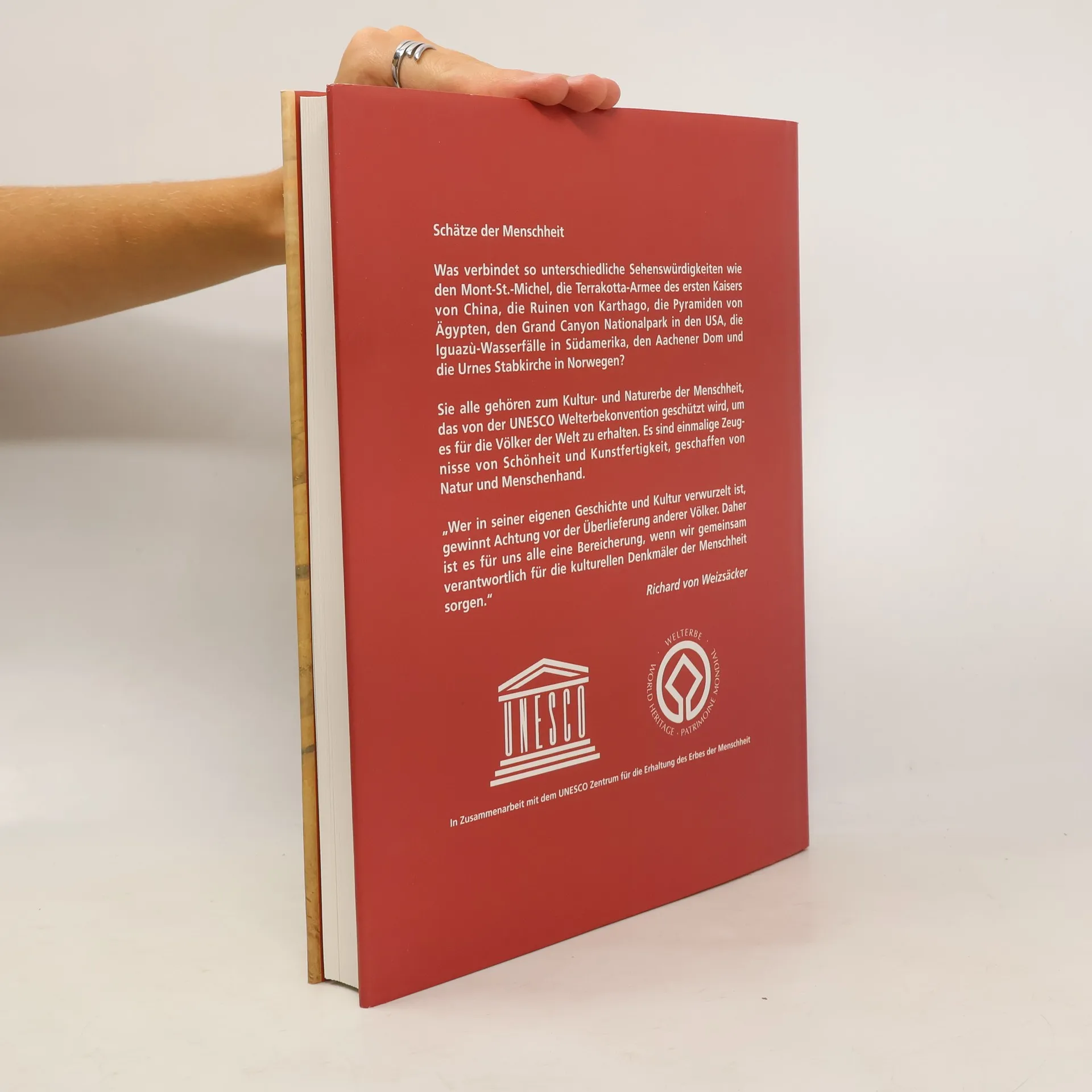 Grossformatiger Bild-Textband zu einmaligen Zeugnissen von Schönheit und Kunstfertigkeit auf allen 5 Kontinenten (z.B. die Terrakotta-Armee des ersten Kaisers von China, die Pyramiden in Ägypten oder der Grand Canyon im Westen der USA).