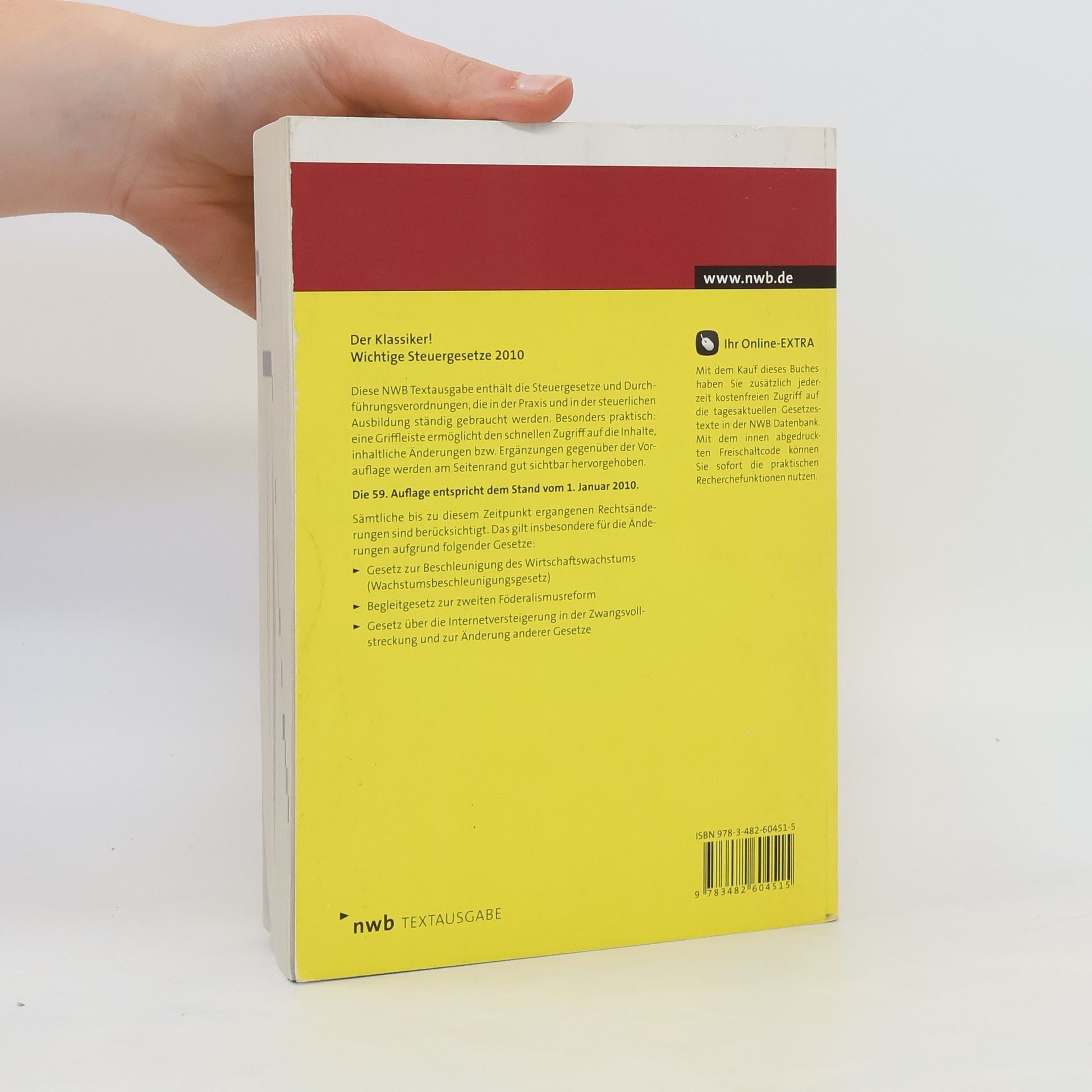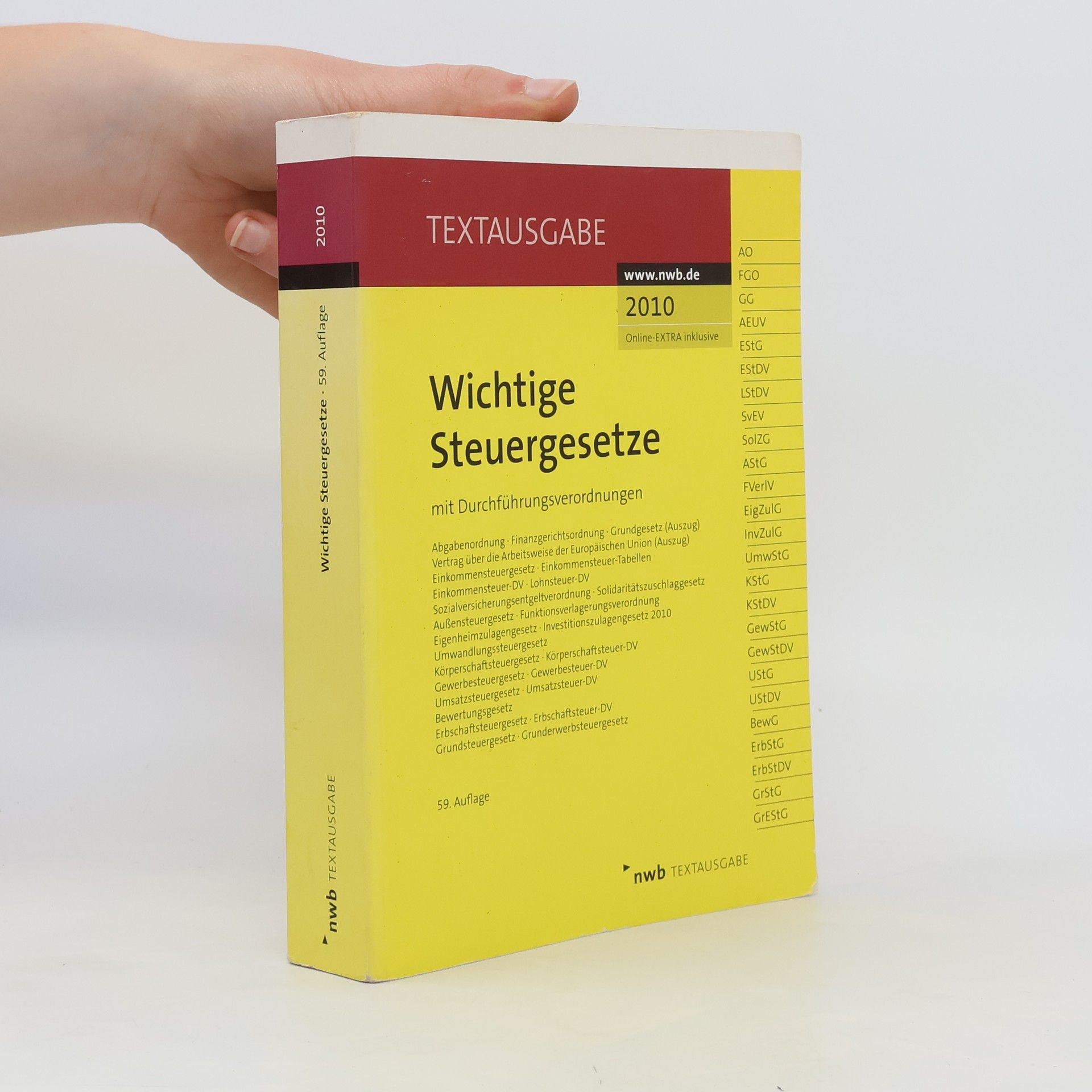 Diese NWB Textausgabe enthält die Steuergesetze und Durchführungsverordnungen, die in der Praxis und in der steuerlichen Ausbildung täglich verwendet werden. Sie ist als Grundlagenmaterial im Steuerrecht unentbehrlich und hat sich besonders in der steuerlichen Ausbildung bewährt. Ein praktischer Vorteil ist die Griffleiste, die einen schnellen Zugriff auf die Inhalte ermöglicht. Änderungen und Ergänzungen gegenüber der Vorauflage werden am Seitenrand gut sichtbar hervorgehoben. Die 59. Auflage entspricht dem Stand vom 1. Januar 2010 und berücksichtigt sämtliche bis zu diesem Zeitpunkt ergangenen Rechtsänderungen, insbesondere die Änderungen aufgrund des Gesetzes zur Beschleunigung des Wirtschaftswachstums, des Begleitgesetzes zur zweiten Föderalismusreform sowie des Gesetzes über die Internetversteigerung in der Zwangsvollstreckung. Die NWB Textausgabe erscheint jährlich und wird von der NWB Redaktion bearbeitet, bei umfangreichen Änderungen auch unterjährig aktualisiert. Inhaltlich umfasst die Ausgabe unter anderem die Abgabenordnung, Finanzgerichtsordnung, Auszüge aus dem Grundgesetz und dem Vertrag über die Arbeitsweise der Europäischen Union, sowie verschiedene Steuergesetze wie das Einkommensteuergesetz, Körperschaftsteuergesetz, Gewerbesteuergesetz und Umsatzsteuergesetz, inklusive der entsprechenden Durchführungsverordnungen.