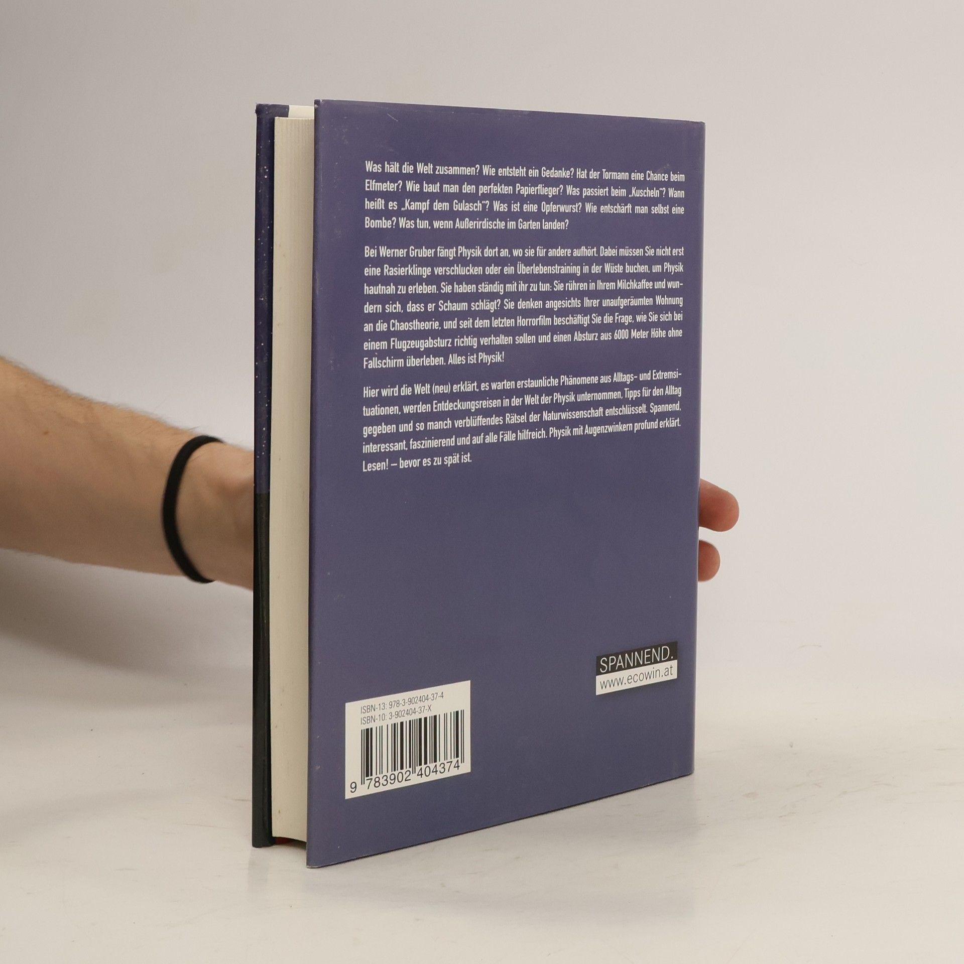 Was hält die Welt zusammen? Wie entsteht ein Gedanke? Hat der Tormann eine Chance beim Elfmeter? Wie baut man den perfekten Papierflieger? Was passiert beim „Kuscheln“? Wann heisst es „Kampf dem Gulasch“? Was ist eine Opferwurst? Wie entschärft man selbst eine Bombe? Was tun, wenn Außerirdische im Garten landen? Bei Werner Gruber fängt Physik dort an, wo sie für andere aufhört. Dabei müssen Sie nicht erst eine Rasierklinge verschlucken oder ein Überlebenstraining in der Wüste buchen, um Physik hautnah zu erleben. Sie haben ständig mit ihr zu tun: Sie rühren in Ihrem Milchkaffee und wundern sich, dass er Schaum schlägt? Sie denken angesichts Ihrer unaufgeräumten Wohnung an die Chaostheorie, und seit dem letzten Horrorfilm beschäftigt Sie die Frage, wie Sie sich bei einem Flugzeugabsturz richtig verhalten sollen und einen Absturz aus 6000 Meter Höhe ohne Fallschirm überleben. Alles ist Physik! Hier wird die Welt (neu) erklärt, es warten erstaunliche Phänomene aus Alltags- und Extremsituationen, werden Entdeckungsreisen in der Welt der Physik unternommen, Tipps für den Alltag gegeben und so manch verblüffendes Rätsel der Naturwissenschaft entschlüsselt. Spannend, interessant, faszinierend und auf alle Fälle hilfreich. Physik mit Augenzwinkern profund erklärt. Lesen! – bevor es zu spät ist.