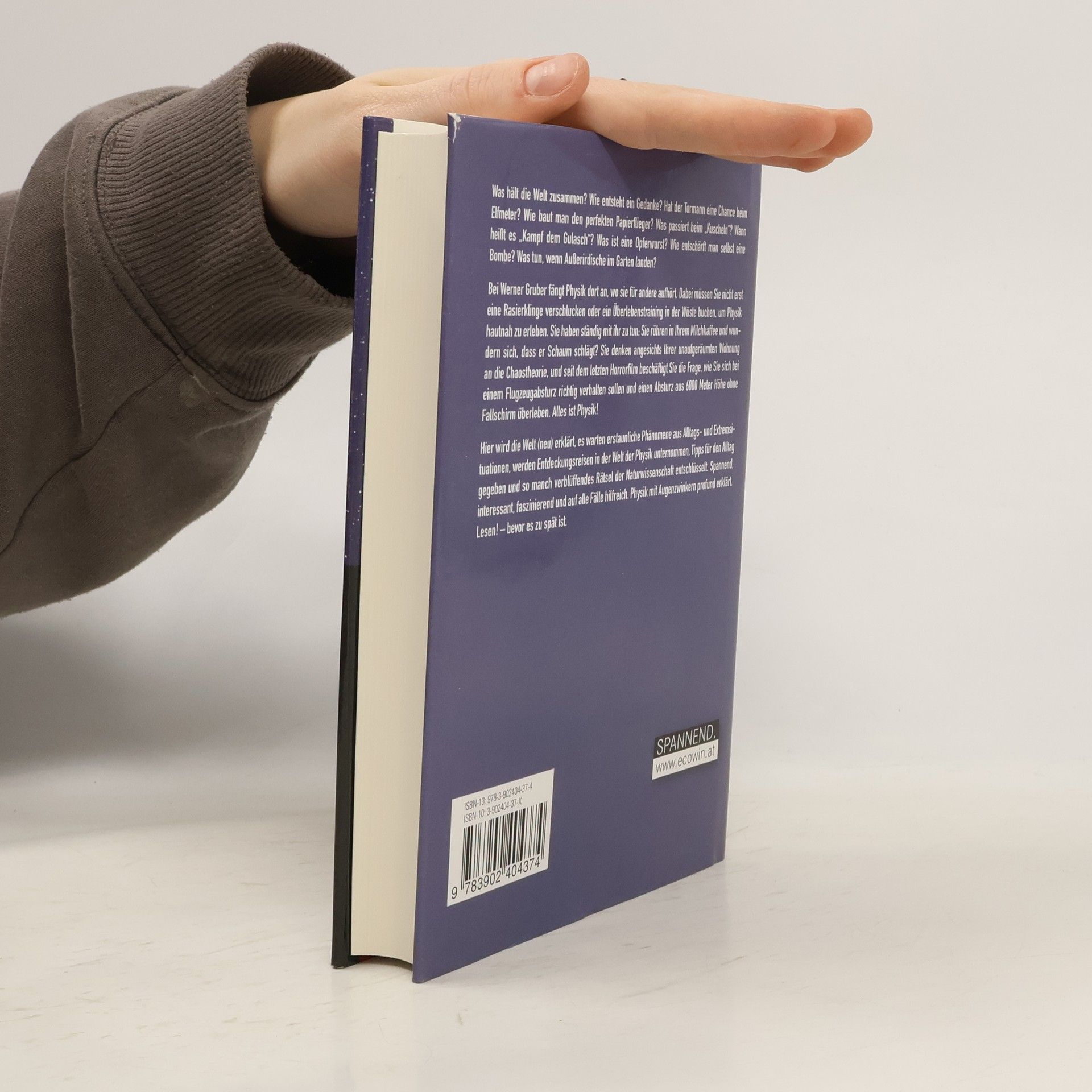 Was hält die Welt zusammen? Wie entsteht ein Gedanke? Hat der Tormann eine Chance beim Elfmeter? Wie baut man den perfekten Papierflieger? Was passiert beim „Kuscheln“? Wann heisst es „Kampf dem Gulasch“? Was ist eine Opferwurst? Wie entschärft man selbst eine Bombe? Was tun, wenn Außerirdische im Garten landen? Bei Werner Gruber fängt Physik dort an, wo sie für andere aufhört. Dabei müssen Sie nicht erst eine Rasierklinge verschlucken oder ein Überlebenstraining in der Wüste buchen, um Physik hautnah zu erleben. Sie haben ständig mit ihr zu tun: Sie rühren in Ihrem Milchkaffee und wundern sich, dass er Schaum schlägt? Sie denken angesichts Ihrer unaufgeräumten Wohnung an die Chaostheorie, und seit dem letzten Horrorfilm beschäftigt Sie die Frage, wie Sie sich bei einem Flugzeugabsturz richtig verhalten sollen und einen Absturz aus 6000 Meter Höhe ohne Fallschirm überleben. Alles ist Physik! Hier wird die Welt (neu) erklärt, es warten erstaunliche Phänomene aus Alltags- und Extremsituationen, werden Entdeckungsreisen in der Welt der Physik unternommen, Tipps für den Alltag gegeben und so manch verblüffendes Rätsel der Naturwissenschaft entschlüsselt. Spannend, interessant, faszinierend und auf alle Fälle hilfreich. Physik mit Augenzwinkern profund erklärt. Lesen! – bevor es zu spät ist.