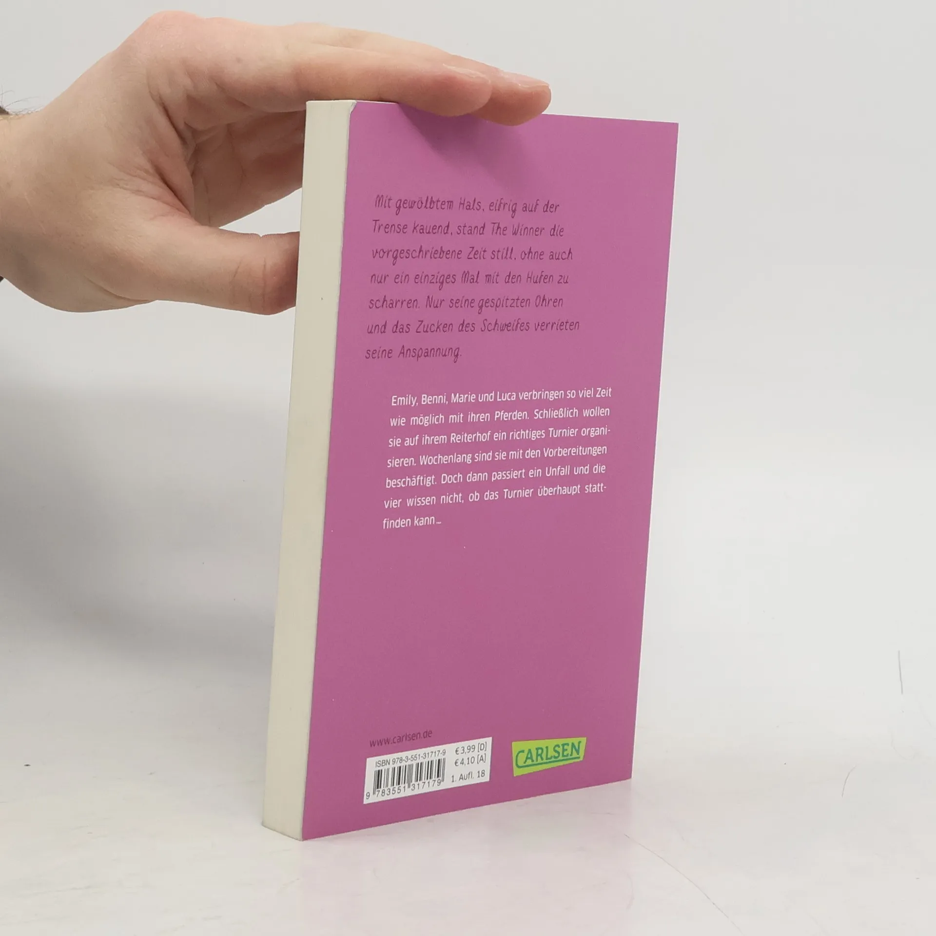 Emily, Benni, Marie und Luca verbringen so viel Zeit wie möglich mit ihren Pferden. Schließlich wollen sie auf ihrem Reiterhof ein richtiges Turnier organisieren. Wochenlang sind sie mit den Vorbereitungen beschäftigt. Doch dann passiert ein Unfall und die vier wissen nicht, ob das Turnier überhaupt stattfinden kann …