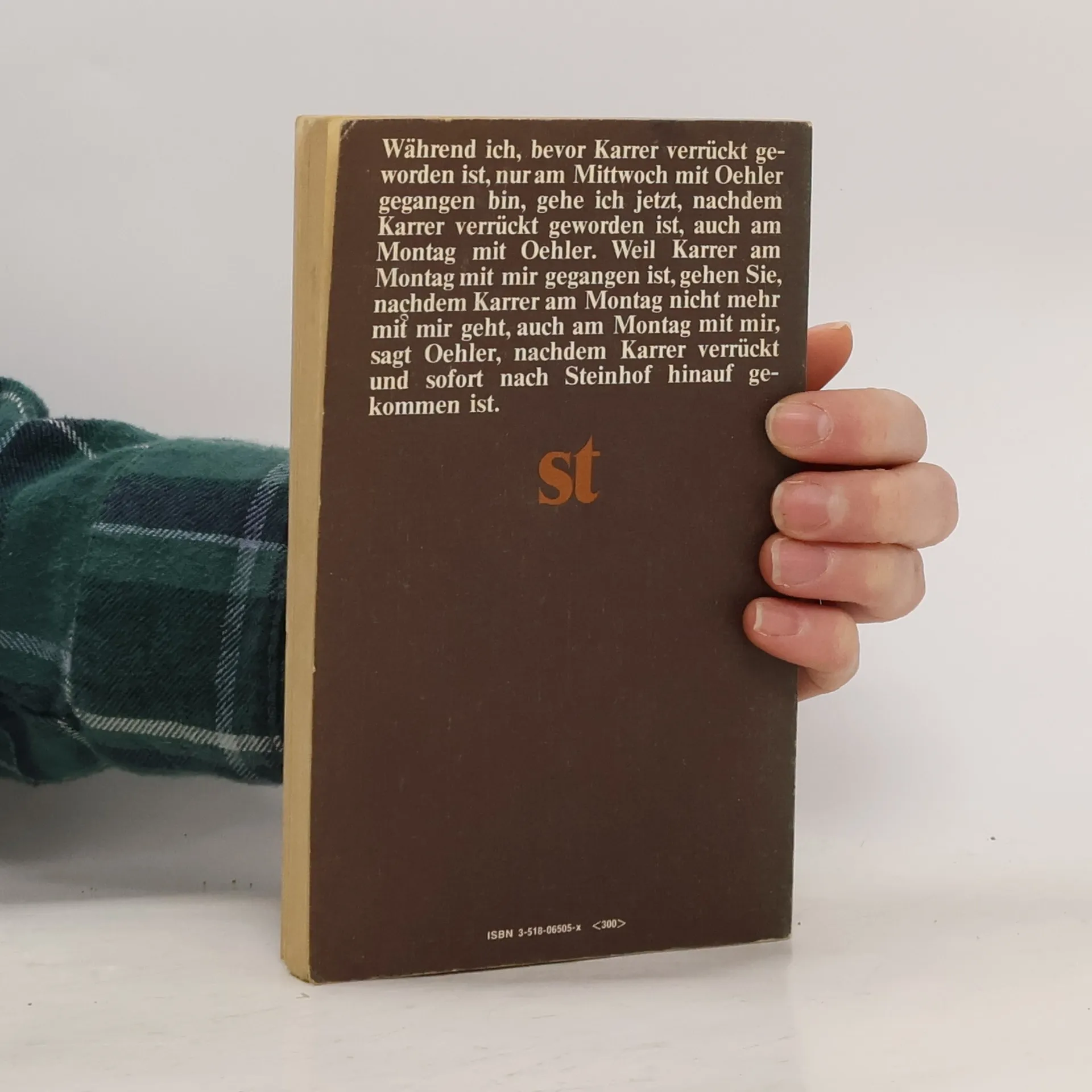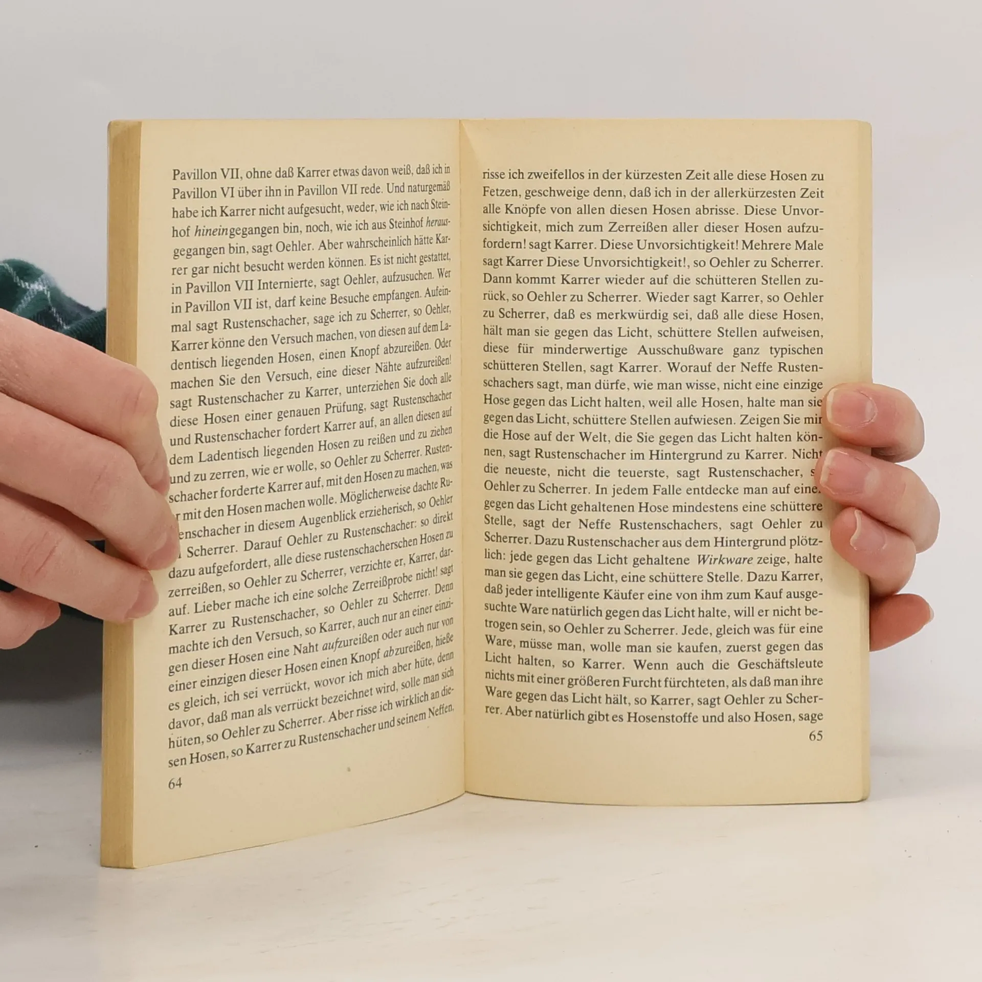 Auf regelmäßigen Spaziergängen berichtet Oehler, der früher mit Karrer ging, einem Dritten, warum Karrer verrückt geworden und nach Steinhof hinaufgekommen ist. Für Karrer war das Gehen Anlaß und Ausdruck seiner Denkbewegung. »Mit Karrer zu gehen, ist eine ununterbrochene Folge von Denkvorgängen gewesen.«, Denkvorgänge, in den Karrer sich klarwerden wollte über die Beziehung des Denkens zu den Gegenständen, über das Verhältnis von Bewegung und Stillstand.