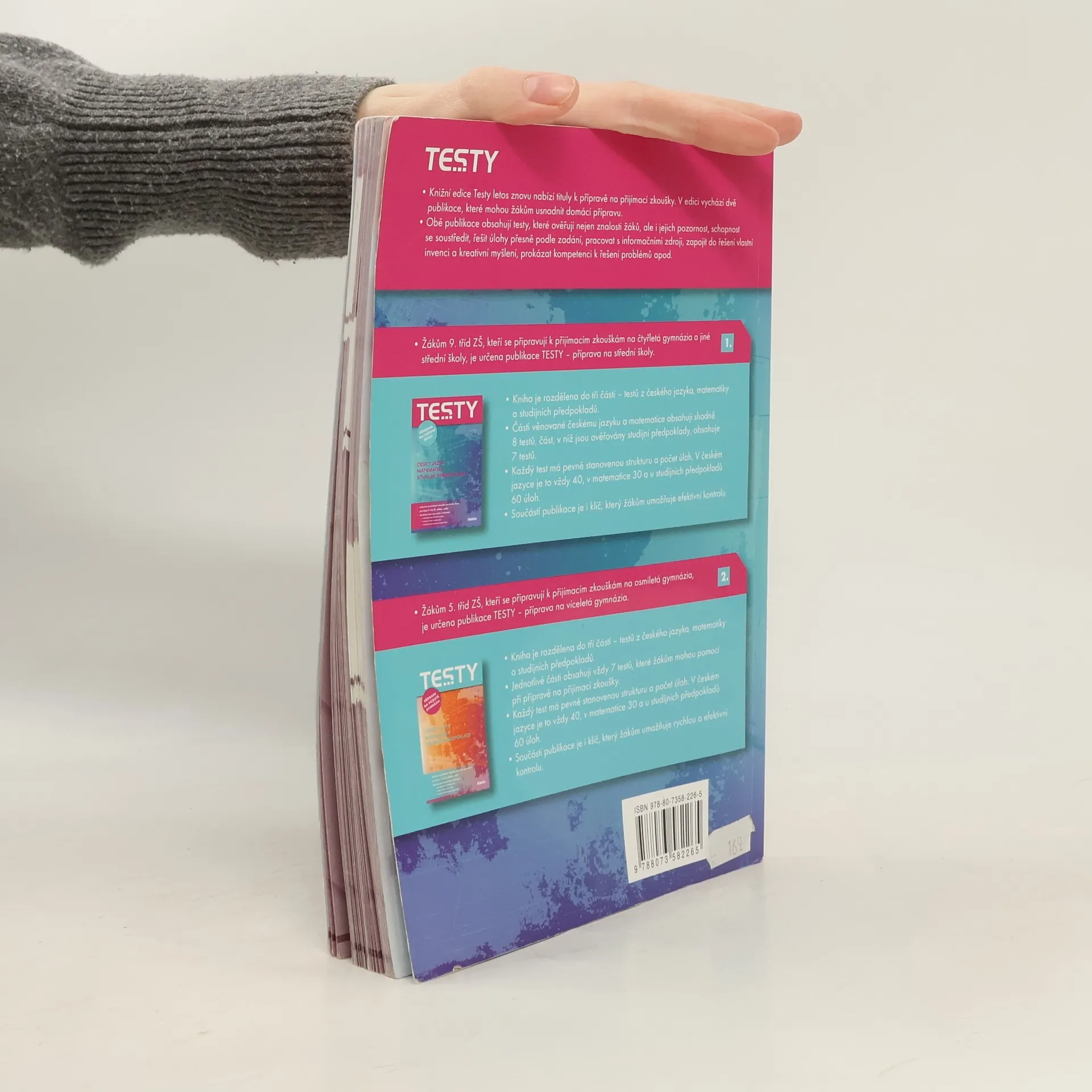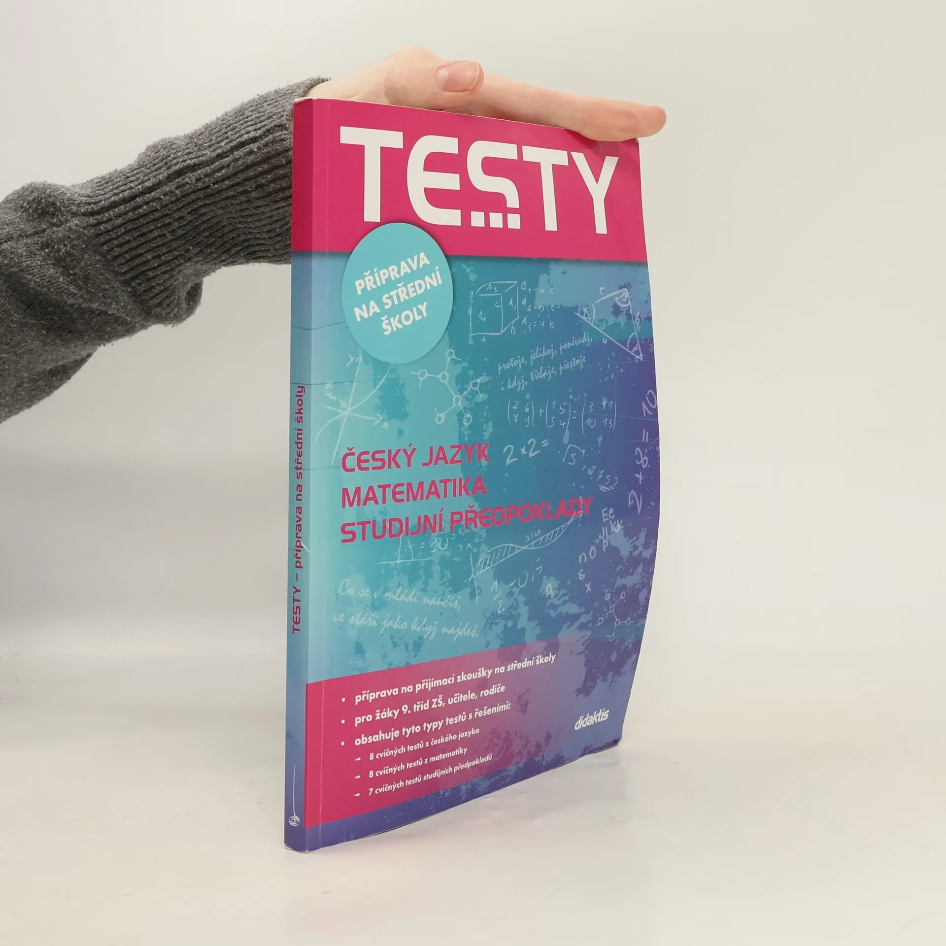 Knižní edice TESTY přináší zcela nový titul k přípravě na přijímací zkoušky, který může žákům 9. tříd ZŠ usnadnit domácí přípravu na přijímací zkoušky na střední školy. Publikace obsahuje testy z českého jazyka, matematiky a testy studijních předpokladů. . Publikace je určena žákům 9. tříd ZŠ, kteří se připravují na přijímací zkoušky na čtyřletá gymnázia a jiné střední školy. . Kniha je rozdělena do tří částí testů z českého jazyka, matematiky a studijních předpokladů. Části věnované českému jazyku a matematice obsahují shodně 8 testů, část, v níž jsou ověřovány studijní předpoklady, obsahuje 7 testů. . Každý test má předem stanovenou strukturu a počet úloh. V českém jazyce je to vždy 40, v matematice 30 a u studijních předpokladů 60 úloh. . Součástí publikace je i klíč, který žákům umožňuje rychlou a efektivní kontrolu.