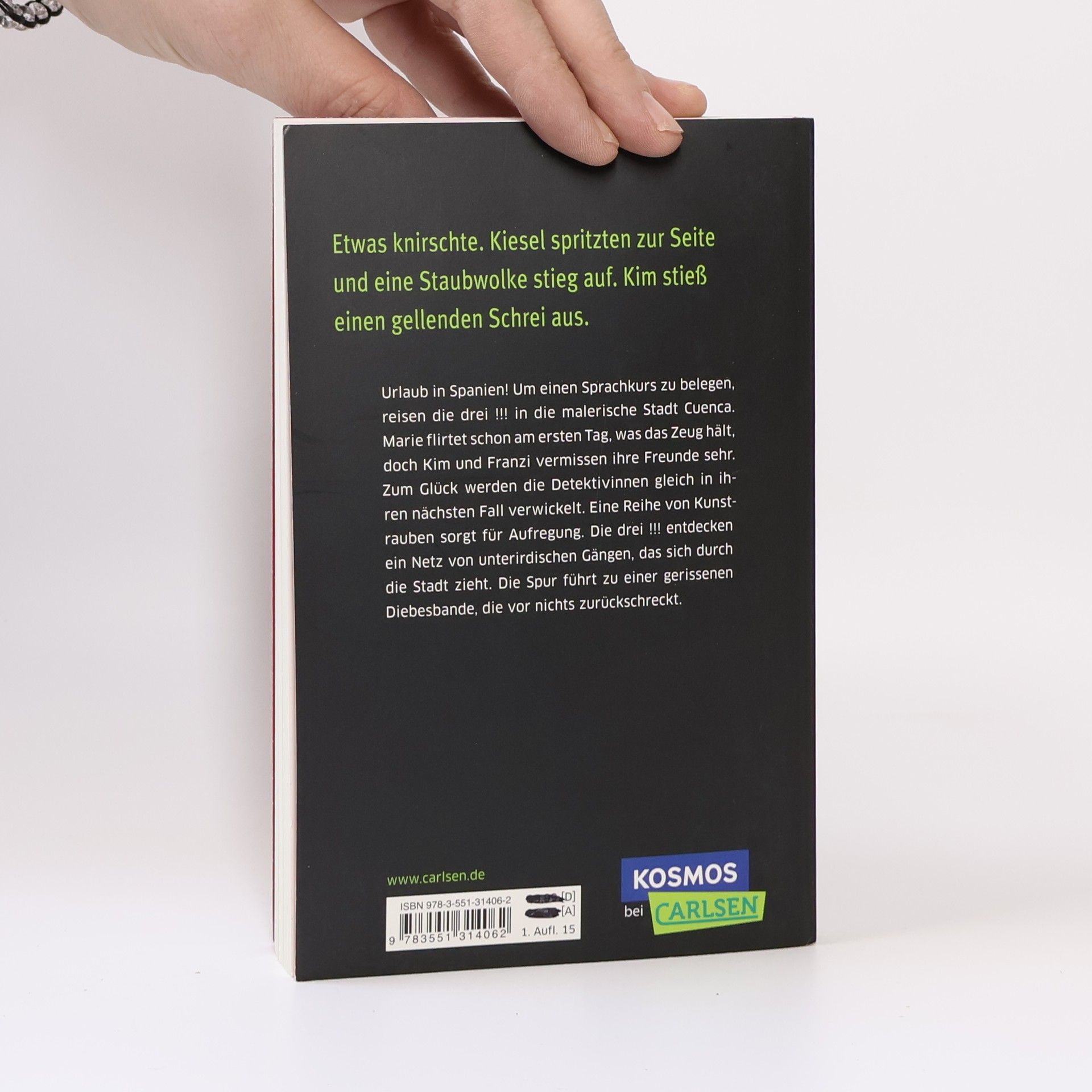 Urlaub in Spanien! Um einen Sprachkurs zu belegen, reisen die drei !!! in die malerische Stadt Cuenca. Marie flirtet schon am ersten Tag, was das Zeug hält, doch Kim und Franzi vermissen ihre Freunde sehr. Zum Glück werden die Detektivinnen gleich in ihren nächsten Fall verwickelt. Eine Reihe von Kunstrauben sorgt für Aufregung. Die drei !!! entdecken ein Netz von unterirdischen Gängen, das sich durch die Stadt zieht. Die Spur führt zu einer gerissenen Diebesbande, die vor nichts zurückschreckt.