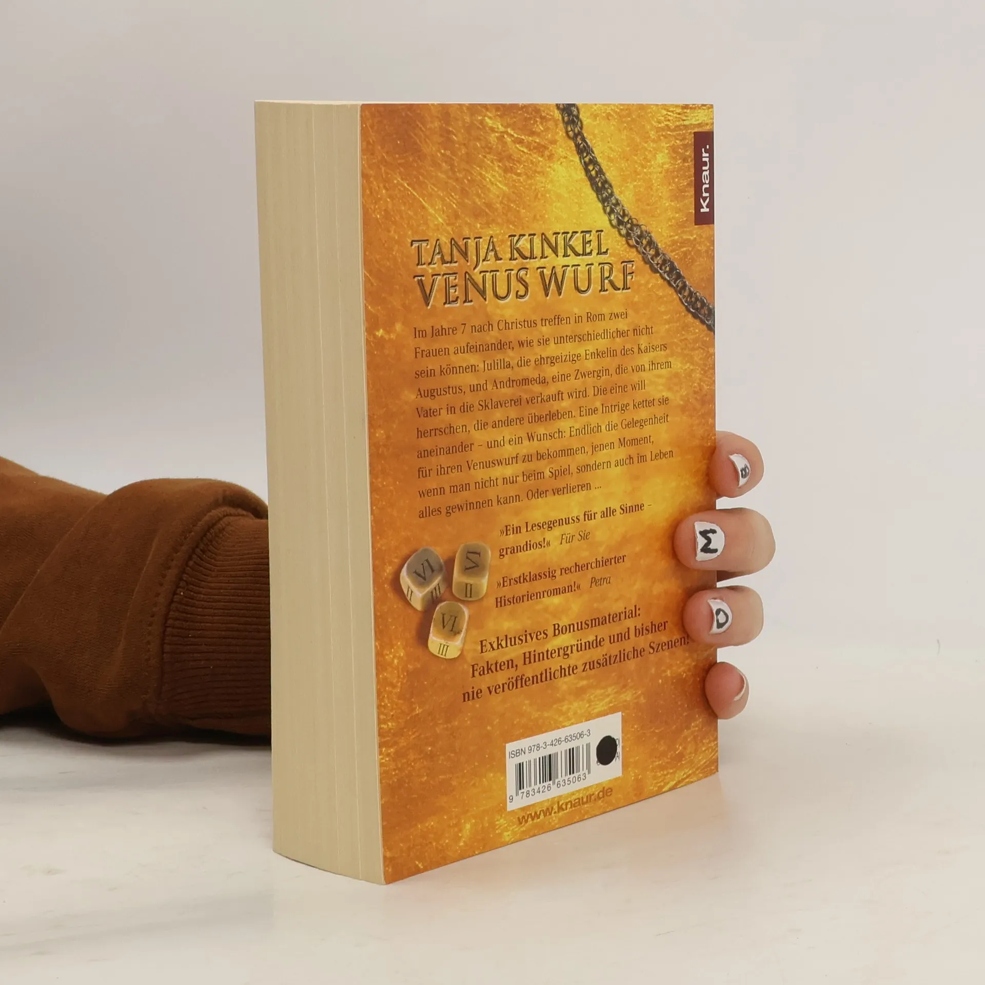 Das mächtige Rom im Jahre sieben nach Christus. Zwei Frauen, wie sie unterschiedlicher nicht sein könnten: Julilla, die machthungrige Enkelin des Augustus, und Andromeda, eine Zwergin, die von ihrem Vater in die Sklaverei verkauft wurde. Die eine will herrschen. Die andere überleben. Eine Intrige kettet sie aneinander – und ein Wunsch: endlich die Gelegenheit für ihren Venuswurf zu bekommen, jenen Moment, wenn man nicht nur beim Spiel, sondern auch im Leben alles gewinnen kann. Oder verlieren …