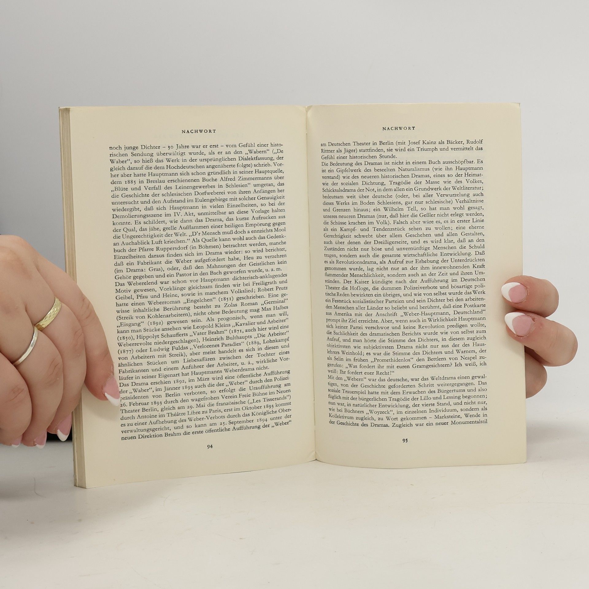 Ein Funke genügt: Als ein hungerleidender Junge zusammenbricht, kommt es zu Protesten der ausgebeuteten Weber vor der Villa des Fabrikanten Dreißiger. Die Situation eskaliert. Hauptmanns Drama über den schlesischen Weberaufstand von 1844 war ein Politikum – der ersten öffentlichen Aufführung in Berlin 1894 ging ein langwieriger Zensurprozess voraus, Kaiser Wilhelm II. kündigte seine Loge im »Deutschen Theater«, Sozialdemokraten jubelten. Es betrat aber auch ästhetisches Neuland: Nicht mehr ein Individuum ist »Held« des Dramas, sondern eine Gruppe gleichförmiger Elendsgestalten – die Weber.