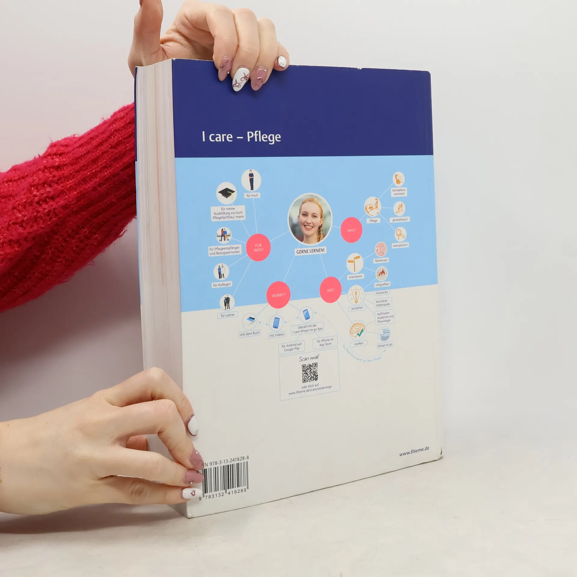 Mit I care legst du den Grundstein für deine generalistische Pflegeausbildung und startest gut vorbereitet in diesen neuen Lebensabschnitt. Das Buch vermittelt Pflegewissen interaktiv und smart, sodass du optimal auf den Beruf als Pflegefachfrau oder -mann vorbereitet bist. Es bietet alle wichtigen Grundlagen der Krankheitslehre, Anatomie und Physiologie und unterstützt dich mit praxisnahen Fallbeispielen, um den oft stressigen Stationsalltag zu meistern. Mindmaps am Kapitelanfang helfen dir, die Themen schnell zu erfassen, während doppelseitige Infografiken komplexe Sachverhalte anschaulich darstellen. Die Inhalte sind leicht verständlich und aus deiner Perspektive geschrieben, sodass du die Bedürfnisse der Pflegeempfänger besser nachvollziehen kannst. WISSEN TO GO Kästen fassen die Lerninhalte kompakt zusammen und sind auch in der kostenlosen I care WISSEN TO GO App verfügbar. Mit komplexen Fallbeispielen und passenden Lernaufgaben vertiefst du dein Wissen im Pflegeprozess und bei Pflegediagnosen. Zusätzlich kannst du über die WISSEN TO GO App digitale Features nutzen, um komplexe Themen in Lehrvideos zu vertiefen. Die Themen umfassen die Grundlagen des Pflegeberufs, Pflegebasismaßnahmen und die Pflege in verschiedenen Settings. Die drei Bände – I care Pflege, I care Krankheitslehre und I care Anatomie, Physiologie – sind grafisch und inhaltlich abgestimmt und bieten dir eine umfassende Vorbereitung auf den Pflegeallt