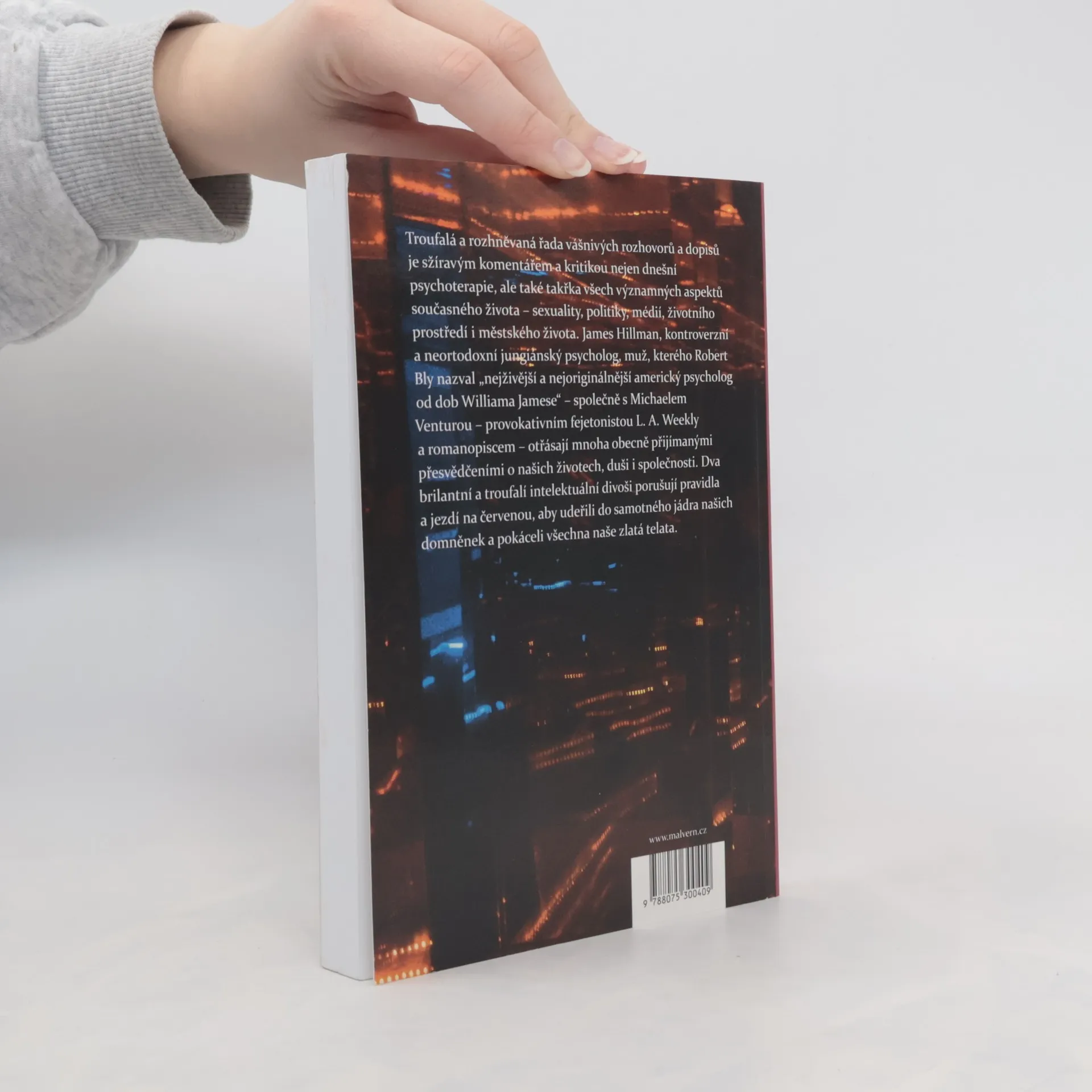Troufalá a rozhněvaná řada vášnivých rozhovorů a dopisů je sžíravým komentářem a kritikou nejen dnešní psychoterapie, ale také takřka všech významných aspektů současného života – sexuality, politiky, médií, životního prostředí i městského života. James Hillman, kontroverzní a neortodoxní jungiánský psycholog, muž, kterého Robert Bly nazval „nejživější a nejoriginálnější americký psycholog od dob Williama Jamese“ – společně s Michaelem Venturou – provokativním fejetonistou L. A. Weekly a romanopiscem – otřásají mnoha obecně přijímanými přesvědčeními o našich životech, duši i společnosti. Dva brilantní a troufalí intelektuální divoši porušují pravidla a jezdí na červenou, aby udeřili do samotného jádra našich domněnek a pokáceli všechna naše zlatá telata.