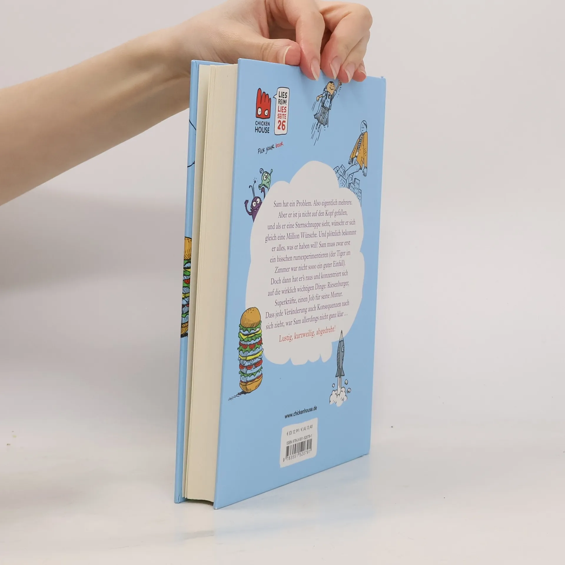 Sam hat ein Problem. Also eigentlich mehrere. Aber er ist ja nicht auf den Kopf gefallen, also wünscht er sich gleich 1 Million Wünsche, als er eine Sternschnuppe sieht. Und plötzlich wird alles, was er haben will, wahr. Sam muss zwar erst ein bisschen rumexperimentieren (der Tiger im Zimmer war nicht sooo ein guter Einfall). Doch dann hat er’s raus und konzentriert sich auf die wirklich wichtigen Dinge: Riesenburger, Superkräfte, einen Job für seine Mutter. Dass jede Veränderung Konsequenzen nach sich zieht, war Sam allerdings nicht ganz klar …