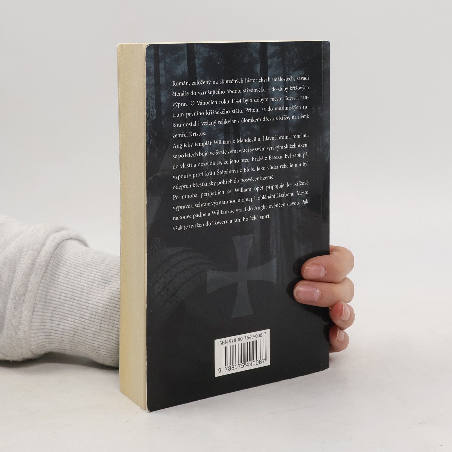 Román zavádí čtenáře do vzrušujícího období středověkých křížových výprav. O Vánocích roku 1144 bylo dobyto město Edessa, centrum prvního křižáckého státu. Přitom se do muslimských rukou dostal i vzácný relikviář s úlomkem dřeva z kříže, na němž zemřel Kristus. Anglický templář William z Mandevillu se po letech bojů ve Svaté zemi vrací do vlasti a dozvídá se, že jeho otec byl zabit při vzpouře proti králi Štěpánovi z Blois. Po mnoha peripetiích se William opět připojuje ke křížové výpravě a sehraje významnou úlohu při obléhání Lisabonu. Město nakonec padne, William získá zpět vzácnou relikvii a slavně přijíždí do Anglie. Podaří se mu uniknout z Toweru, kam ho dá uvrhnout zrádný bratr Geoffrey, a stává se novým hrabětem z Essexu. Brožované vydání.