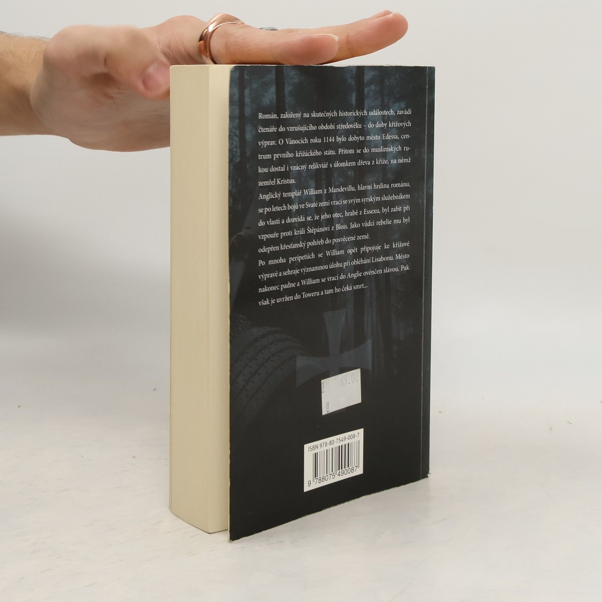 Román zavádí čtenáře do vzrušujícího období středověkých křížových výprav. O Vánocích roku 1144 bylo dobyto město Edessa, centrum prvního křižáckého státu. Přitom se do muslimských rukou dostal i vzácný relikviář s úlomkem dřeva z kříže, na němž zemřel Kristus. Anglický templář William z Mandevillu se po letech bojů ve Svaté zemi vrací do vlasti a dozvídá se, že jeho otec byl zabit při vzpouře proti králi Štěpánovi z Blois. Po mnoha peripetiích se William opět připojuje ke křížové výpravě a sehraje významnou úlohu při obléhání Lisabonu. Město nakonec padne, William získá zpět vzácnou relikvii a slavně přijíždí do Anglie. Podaří se mu uniknout z Toweru, kam ho dá uvrhnout zrádný bratr Geoffrey, a stává se novým hrabětem z Essexu. Brožované vydání.