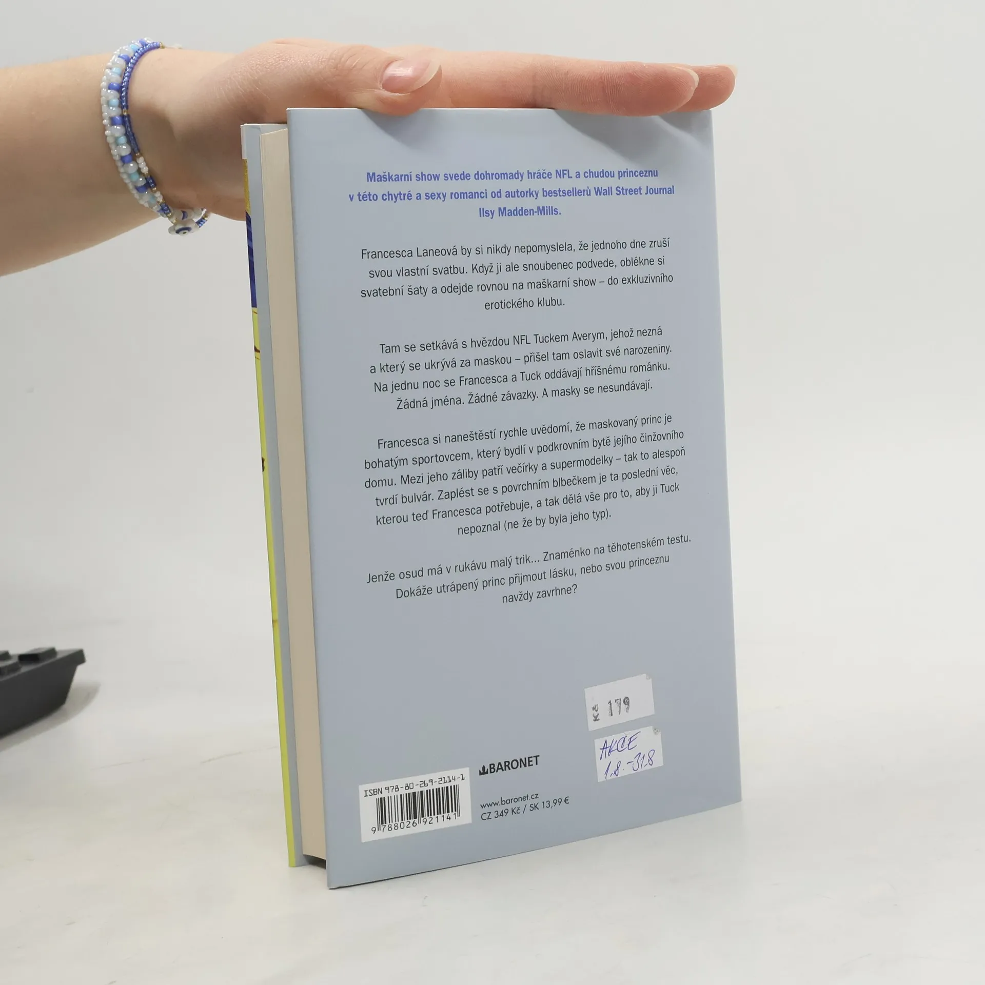 Maškarní ples svede dohromady hráče NFL a chudobnou princeznu v této chytré a sexy romanci od autorky bestsellerů Wall Street Journal Ilsy Madden-Millsové.Rozvážná Francesca Laneová by si nikdy nepomyslela, že jednoho dne zruší svou vlastní svatbu. Ale když ji snoubenec zradí, oblékne si svatební šaty a odejde od oltáře rovnou na maškarní ples - do exkluzivního lifestylového klubu.Tam se setkává s pro ni neznámou hvězdou NFL Tuckem Averym, který je převlečený za prince a ukrývá se za maskou - přišel tam oslavit své narozeniny. Na jednu noc se Francesca a Tuck oddávají hříšnému inkognito románku. Žádná jména. Žádné závazky. A masky se nesundávají.Francesca si naneštěstí rychle uvědomí, že její maskovaný princ je tím bohatým sportovcem, který bydlí v podkrovním bytě jejího činžovního domu. Mezi jeho záliby patří večírky a supermodelky – tak to alespoň tvrdí bulvár. Zaplést se s povrchním blbečkem je ta poslední věc, kterou teď Francesca potřebuje, a tak dělá vše pro to, aby ji Tuck nepoznal (ne že by byla jeho typ).Jenže osud má v rukávu malý trik... znaménko plus na těhotenském testu. Dokáže utrápený princ přijmout lásku, nebo svou princeznu navždy zavrhne?