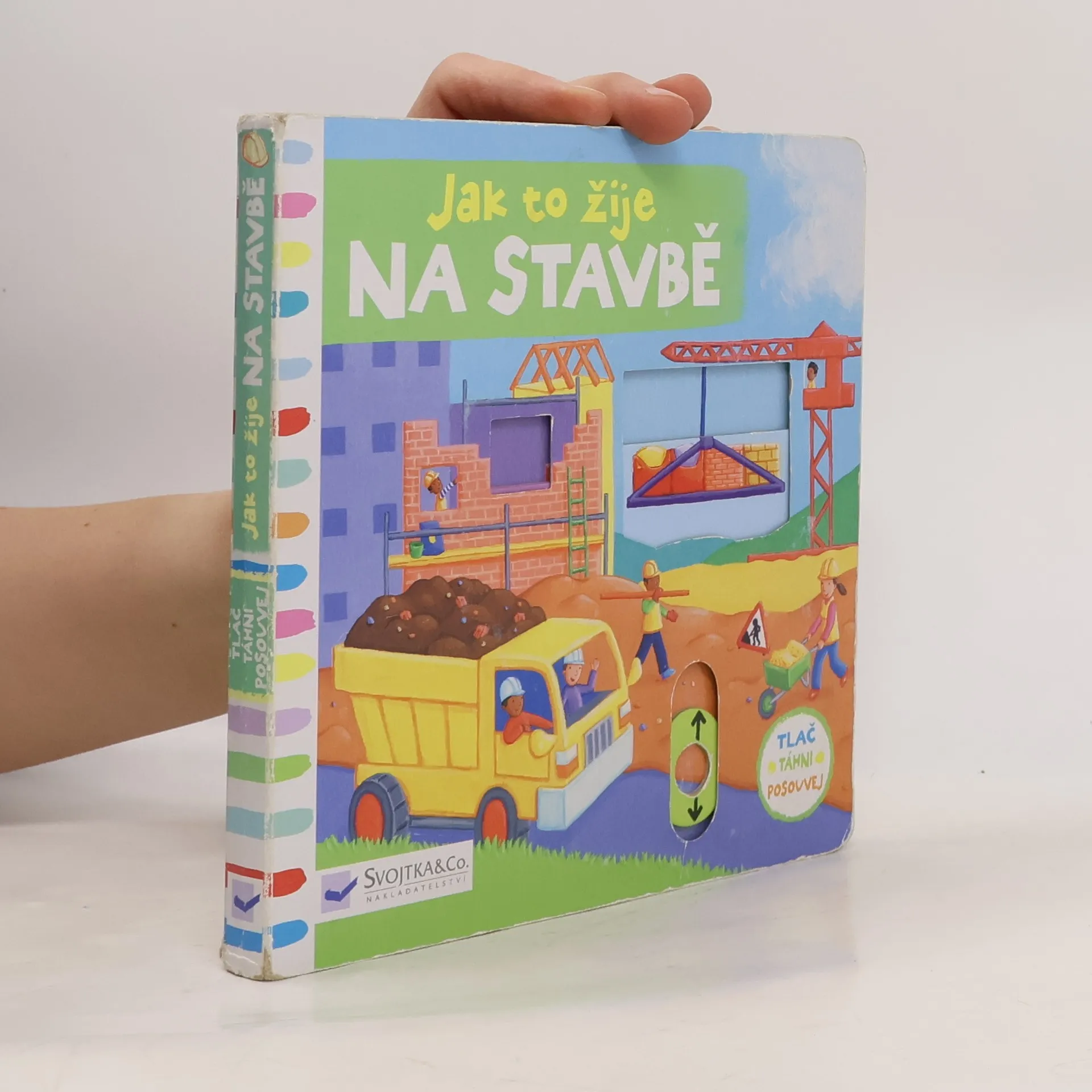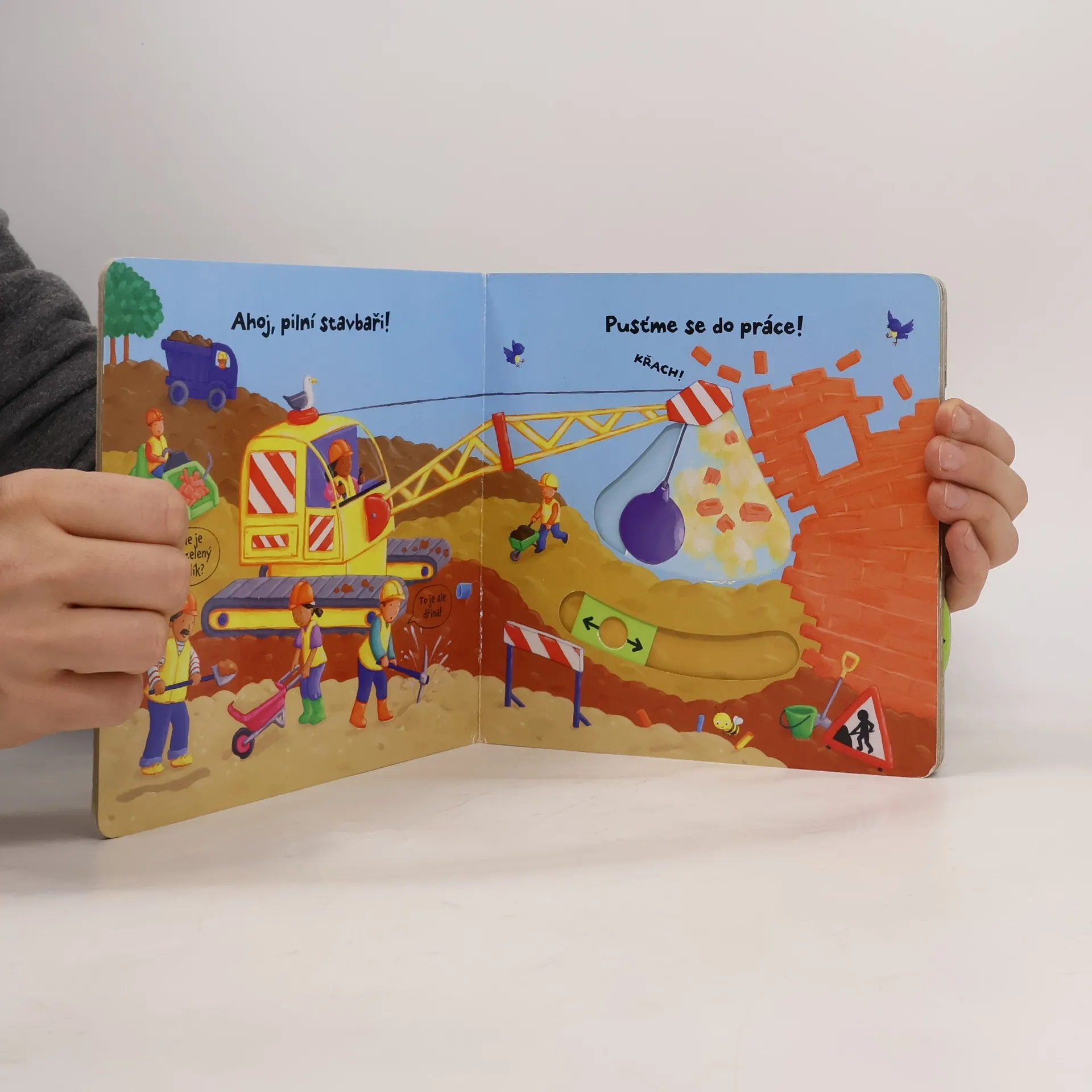 Zábavné leporelo s pohyblivými prvky seznámí děti s tím, co vše se děje na stavbě.