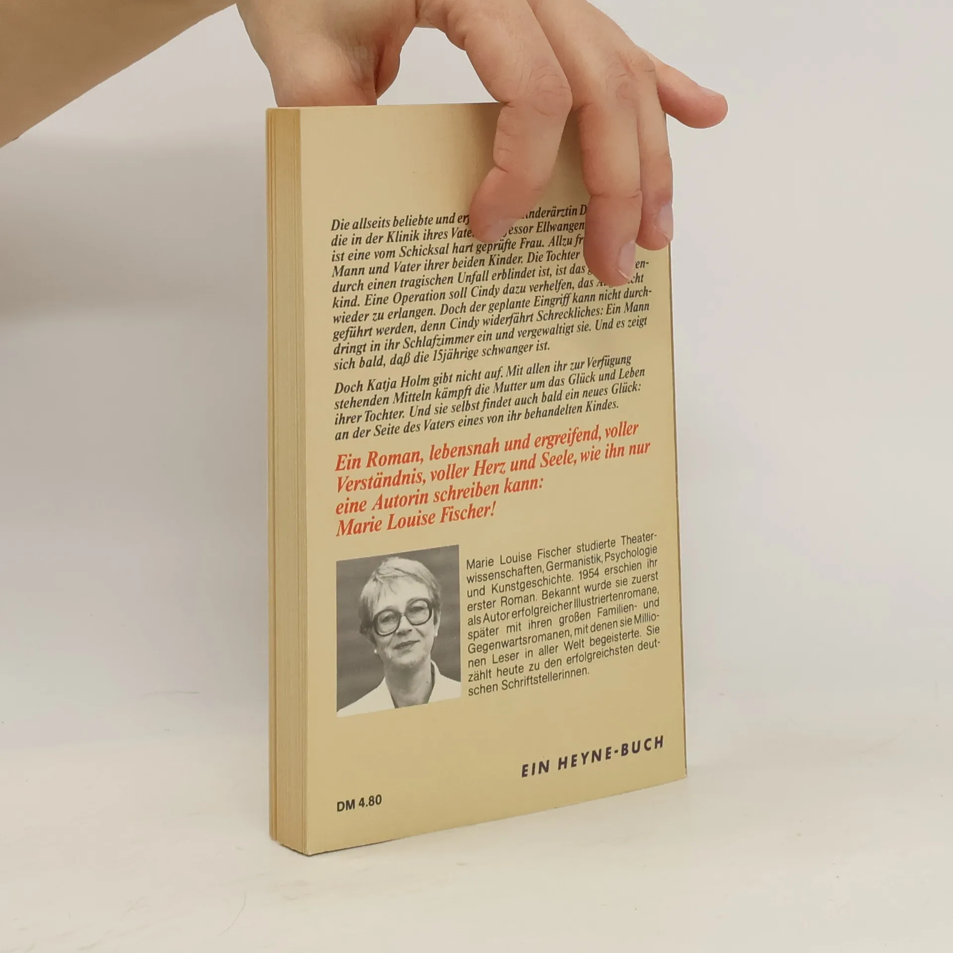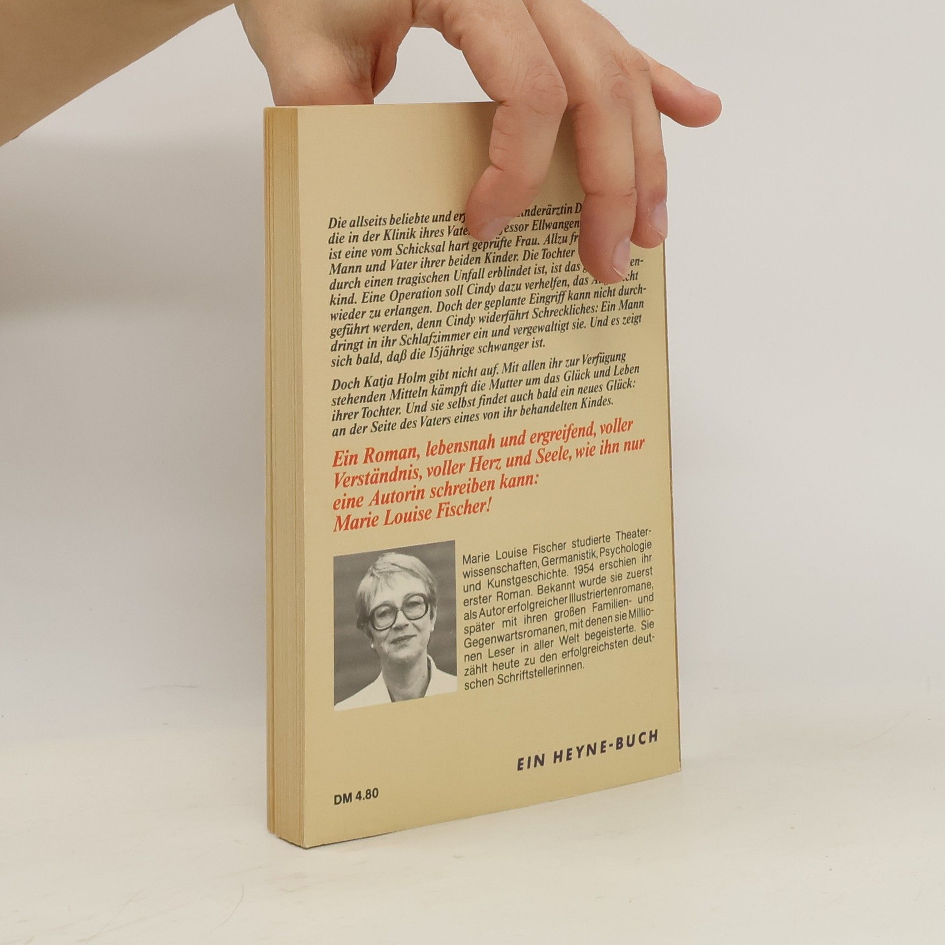 Die allseits beliebte und erfolgreiche Kinderärztin Dr. Katja Holm, die in der Klinik ihres Vaters, Professor Ellwangen, praktiziert, ist eine vom Schicksal hart geprüfte Frau. Allzu früh verstarb ihr Mann und Vater ihrer beiden Kinder. Tochter Cindy, die durch einen tragischen Unfall erblindet ist, ist das große Sorgenkind. Noch schlimmer wird es, als Cindy während eines Wochenendurlaubs, der Katja mit einem Kollegen fernab von zu Hause sein lässt, vergewaltigt wird. Trotz aller Selbstvorwürfe gibt Katja Holm gibt nicht auf. Ein Roman, lebensnah und ergreifend, voller Verständnis, voller Herz und Seele, wie ihn nur eine Autorin schreiben kann: Marie Louise Fischer! Marie Louise Fischer wurde 1922 in Düsseldorf geboren. Nach ihrem Studium arbeitete sie als Lektorin bei der Prag-Film. Da sie die Goldene Stadt nicht rechtzeitig verlassen konnte, wurde sie 1945 interniert und musste über eineinhalb Jahre Zwangsarbeit leisten. Mit dem Kriminalroman "Zerfetzte Segel" hatte sie 1951 ihren ersten großen Erfolg. Von da an entwickelte sich Marie Louise Fischer zu einer überaus erfolgreichen Unterhaltungs- und Jugendschriftstellerin. Ihre über 100 Romane und Krimis und ihre mehr als 50 Kinder- und Jugendbücher wurden in 23 Sprachen übersetzt und erreichten allein in Deutschland eine Gesamtauflage von über 70 Millionen Exemplaren. 82-jährig verstarb die beliebte Schriftstellerin am 2. April 2005 in Prien am Chiemsee.