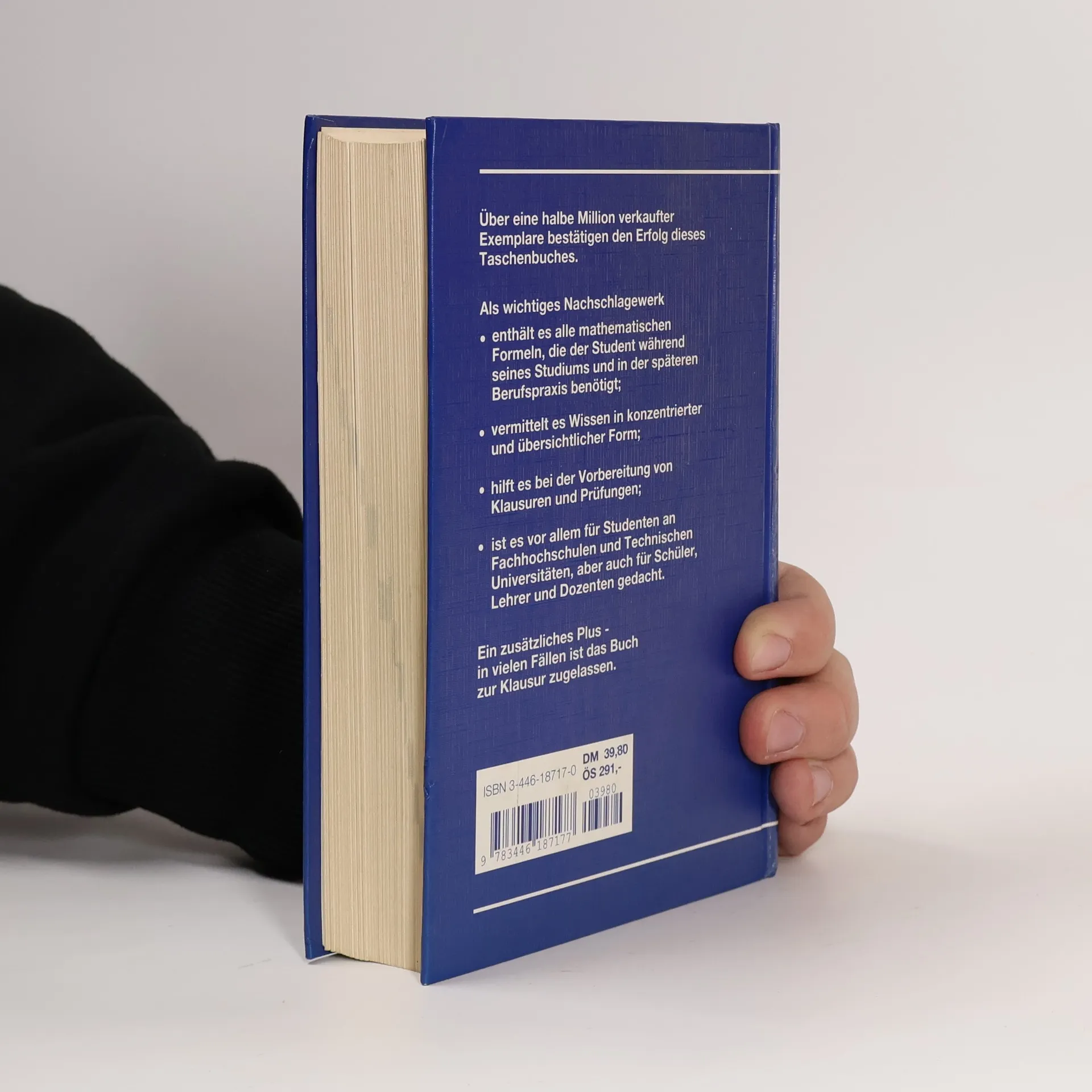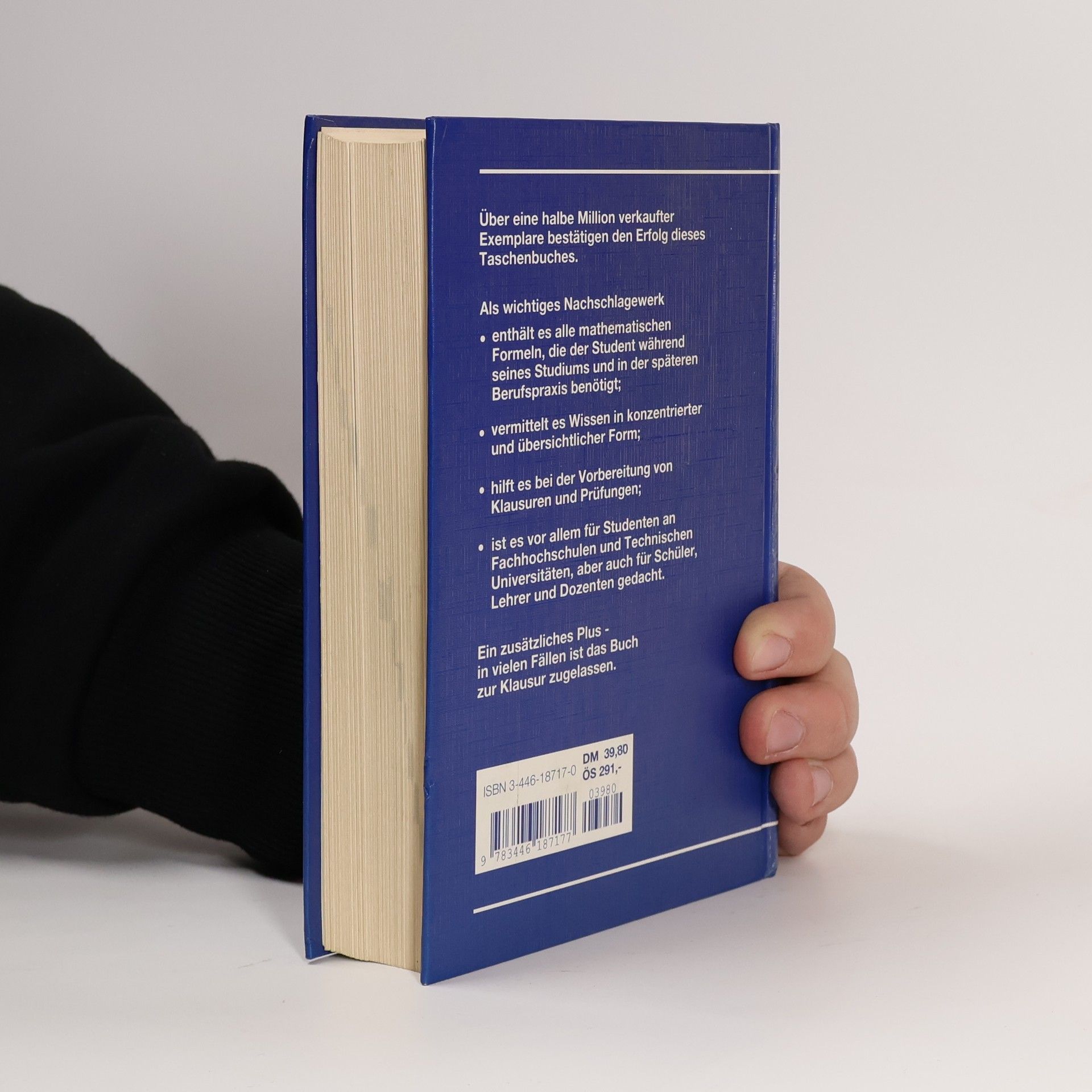 Das handliche, mit festem Umschlag gesicherte Taschenbuch bietet die Inhalte, die in Studium und Beruf gebraucht Logik und Mengen, Arithmetik und Algebra, klassische Geometrie, lineare Algebra, Vektoren und analytische Geometrie, Differenzialrechnung und -gleichung, Wahrscheinlichkeitsrechnung und Statistik (Stochastik). Keine Angst vor Mathematik! Was früher Rechenunterricht genannt wurde, heißt seit langem Mathe und erfordert nicht nur in Gymnasien logisches Denken und entsprechende Problemlösungen. Die vorliegende Formelsammlung ist natürlich nicht nur etwas für pfiffige Gymnasiasten, sondern vor allem für Studierende der technischen Fachrichtungen sowie für Praktiker. Sie soll natürlich kein Lehrbuch ersetzen, kann aber als probates Schulungs- und Hilfsmittel dienen. Ein gut sortiertes Sachregister führt den Leser schnell auf die Seite, die er sucht. Das Buch bietet außerdem Tabellen zu 600 unbestimmten und bestimmten Integralen und im Anhang eine Übersicht ausgewählter mathematischer Zeichen. In den letzten Auflagen wurde die Formelsammlung mehrfach überarbeitet und erweitert, so bei Computerzahlen, uneigentlichen Integralen, Schwingungen, Krümmung von Flächen und der Deltafunktion. Das Kapitel Matrizen wurde um einige spezielle quadratische Matrizen erweitert, die Transformationen werden bevorzugt mittels Matrizen behandelt. Über 500 Zeichnungen erleichtern das Verständnis. --Hans Jürgensen