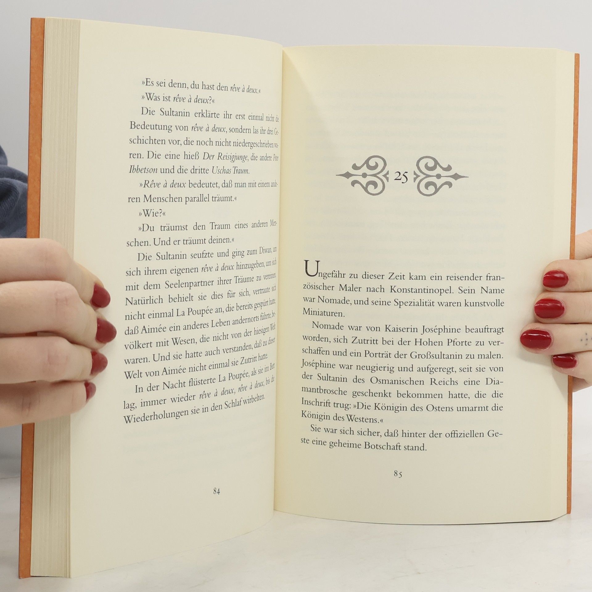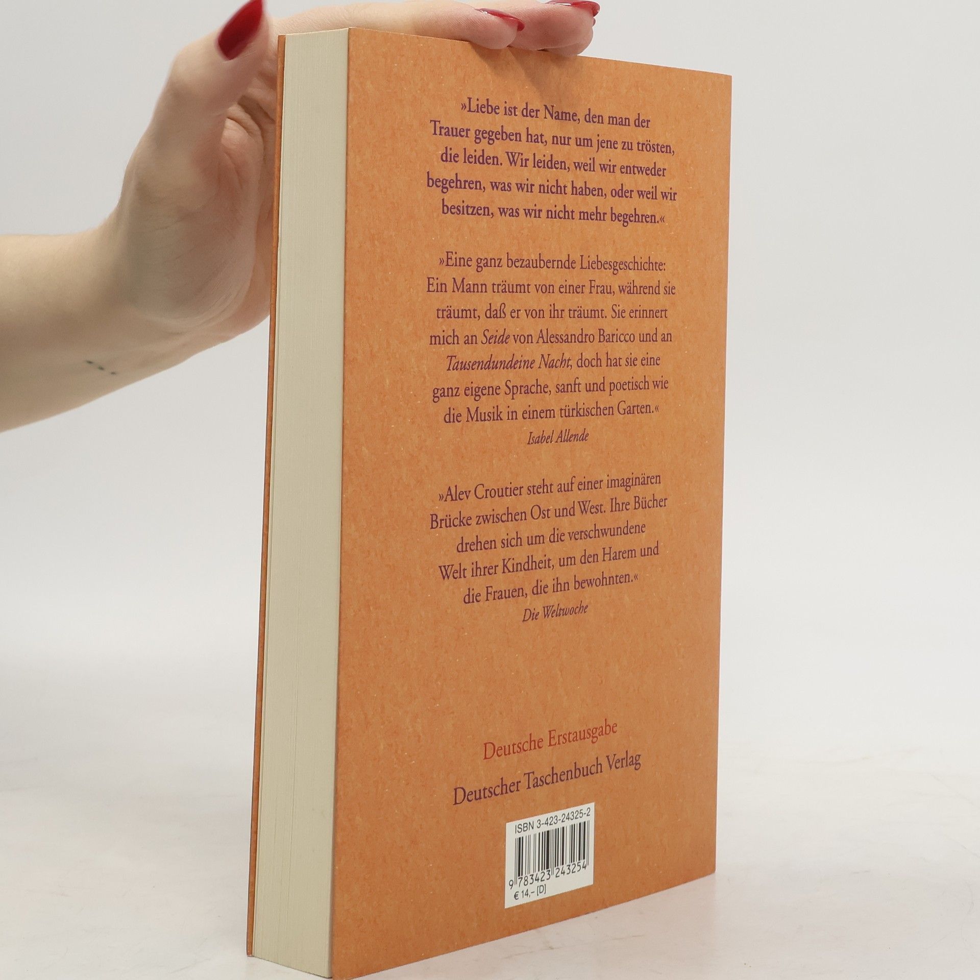 Eine symbolische Vereinigung zwischen Ost und West Casimir de Châteauneuf, Spross aus altem französischem Weinadel, ist 35 Jahre alt, verheiratet und Vater dreier Kinder, als er, gelangweilt vom Leben und wieder einmal auf Geschäftsreise in Paris, eine Entdeckung macht, die ihn für immer verändert. Auf dem Weg zu seiner Mätresse zieht ihn in einem kleinen Laden für Orientalia das Miniaturporträt einer Odaliske in seinen Bann und lässt ihn fortan nicht mehr los. Des Nachts träumt er von ihr, ohne zu wissen, dass zur selben Zeit sie auch von ihm träumt. Wer ist sie, und welcher Zauber liegt in ihren Augen, das eine blau das andere gelb? Casimir macht sich auf in den Orient, sie zu suchen -- wo er ihr erst nach vielen Monaten während der Eröffnung des Suezkanals und als Begleiter der Kaiserin Eugenie begegnen wird. La Poupée ist ihr Name, die lebende Puppe der Sultanin Aimée de Rivery, die aus der französischen Karibik kam, von Sklavenhändlern an den Sultan verkauft und schließlich in den Palast der Tränen, den Harem der Unerwünschten, verbannt wurde. Casimir und La Poupée werden in Mazedonien siedeln und sieben Kinder und viele Enkel haben -- darunter Zehra, die Großmutter Alev Lytle Croutiers. Doch lange vorher schon wird im Westen eine Welt untergehen und im Osten das Donnern von Kanonen zu hören sein. Und so wird es wohl immer sein: Das eine Reich blau, das andere gelb.