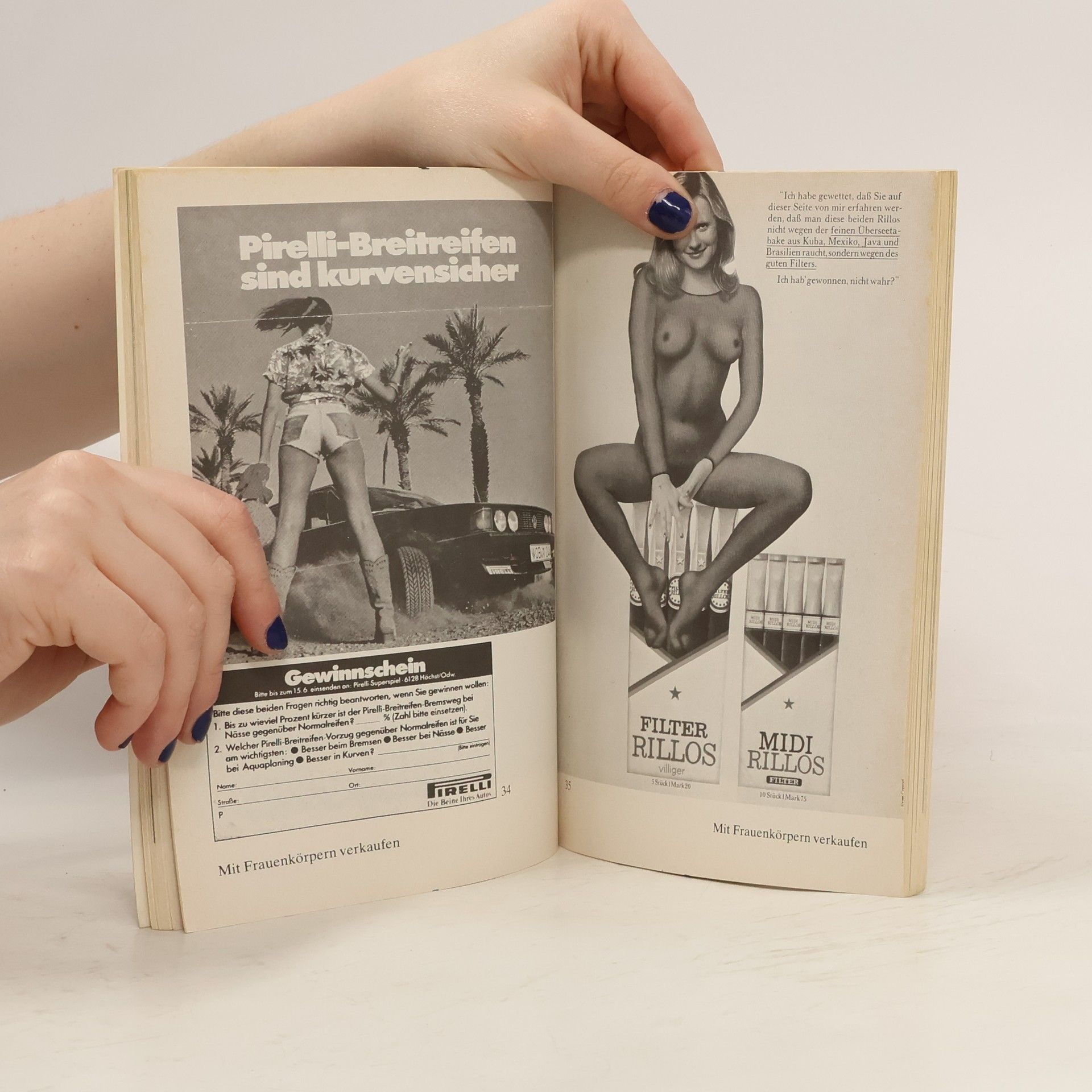 Wir sehen sie täglich und überall: Plakate, auf denen schöne Frauen mit verheißungsvollem Lächeln für Whisky, Zigarillos oder Eiernudeln werben. Es sind Frauen, die — zumeist auf Beine, Po und Busen reduziert — zum Konsum anregen sollen, indem sie Glück und Abenteuer oder auch einfach nur appetitliche Sauberkeit verheißen. Wem fällt das eigentlich heute noch auf, wen stört es gar? Das Auge nimmt diese Luxusgeschöpfe kaum wahr, wenn sie uns von Plakatwänden oder aus dem Fernsehen entgegenlächeln, um Produkte im wahrsten Sinne „an den Mann" zu bringen. Aber was beim täglichen Hinund Wegsehen kaum noch ins Auge sticht, macht in seiner Gesamtheit betroffen, wenn man das Buch von Heide Hering aufschlägt: „Weibs-Bilder. Zeugnisse zum öffentlichen Ansehen der Frau. Ein häßliches Bilderbuch"; ro ro ro aktuell, Rowohlt Verlag, Reinbek 1979; 6,60 DM. Die Verfasserin hat sieben Jahre lang Anzeigen, Titelbilder, Witze und Kalenderreime gesammelt, die sie empört und wütend gemacht haben. Sprüche wie „Die beste Visitenkarte für einen Mann ist eine schöne Frau", oder „Mein Mann sagt, ich sei der angenehmere Teil seiner Karriere" zeigen, daß Frauen in der Werbung vor allem als unselbständige Puppen vorkommen, „sexy, nur Körper, aalglatt".