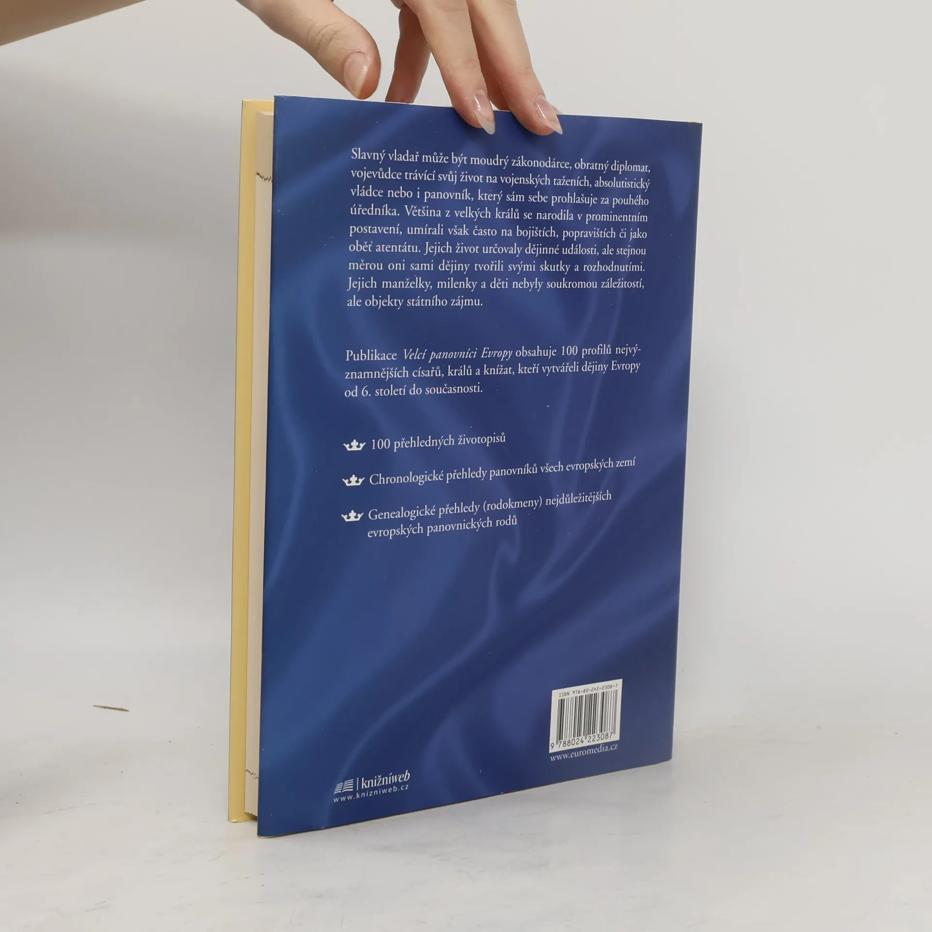100 nejvýznamnějších císařů, králů a knížat evropských dějin Kniha Velcí panovníci Evropy pojednává o stovce významných vládců, kteří v průběhu patnácti století mezi pádem Říma a naší současností nejvýrazněji utvářeli evropské dějiny – ať již stáli u zrodu nových státních útvarů, vítězili v dobyvačných válkách nebo jen vhodně provdali a oženili své potomky. Pomocí profilů jednotlivých klíčových panovníků publikace mapuje evropské dějiny od Ruska, Bulharska či Osmanské říše až po Švédsko a Velkou Británii. Řazení je chronologické, díky čemuž vynikají vzájemné souvislosti mezi děním v různých zemích. Populárně naučný, avšak faktograficky přesný text doplňují kompletní chronologické přehledy panovníků ve všech evropských zemích a především genealogické přehledy (rodokmeny) nejdůležitějších evropských panovnických rodů.