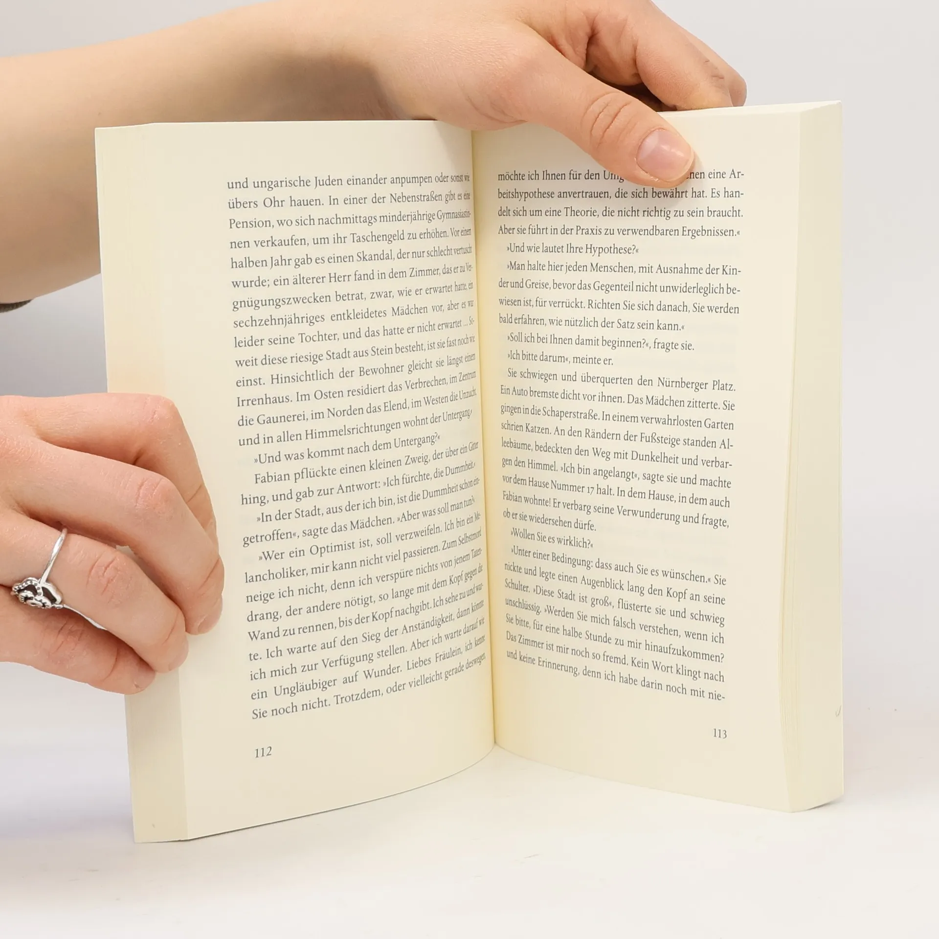 Dr. Jakob Fabian, Germanist und Reklametexter, lässt sich durch das Berlin der »Goldenen Zwanziger« treiben. Er wirft sich in erotische Abenteuer, trinkt mit Journalisten um die Wette und versucht, im Labyrinth der Großstadt seine Integrität und seine Ideale zu behaupten. Doch die Stadt windet sich wie in einem Fiebertraum; die junge Demokratie der Weimarer Republik wird mehr und mehr in ihren Grundfesten erschüttert. Dann lernt Fabian im Atelier einer Bildhauerin, wo sich leichte Mädchen und Todeskandidaten ein Stelldichein geben, die junge Juristin Cornelia kennen. Die beiden verlieben sich – doch die Liebe hat keine Konjunktur.