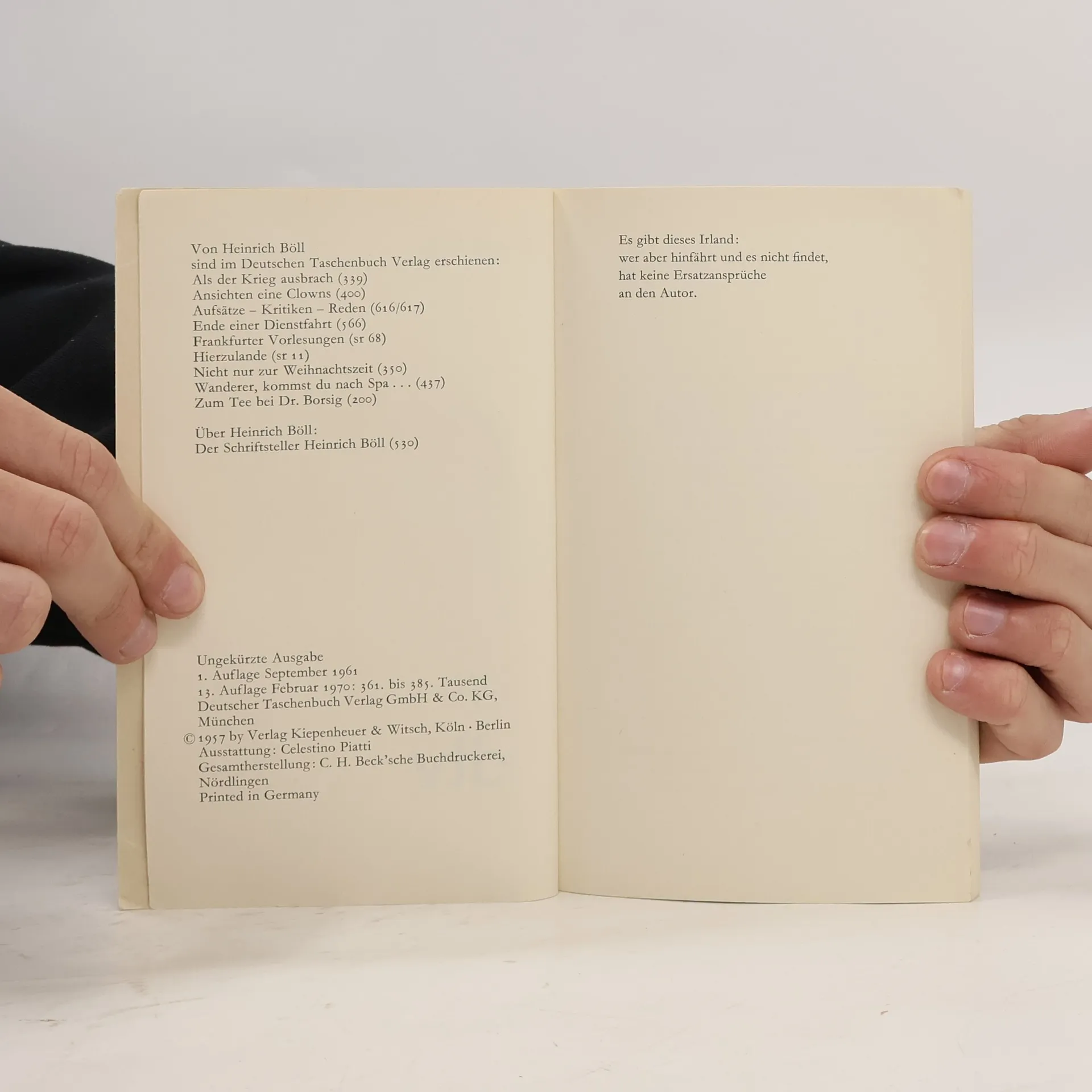 Eine Reise nach Irland: Heinrich Böll stattete mit diesen Aufzeichnungen den Dank ab an eine Landschaft und ihre Menschen, denen er sich seit seinem ersten Besuch auf der Insel im Jahr 1954 wahlverwandtschaftlich verbunden fühlte. In der ›Stuttgarter Zeitung‹ heißt es: »Das Geheimnis dieses Buches, des liebenswertesten Buches von Heinrich Böll, ist, daß kaum ein Wort über die verzwickte Ökonomie und die noch verzwicktere Geschichte dieses kleinen Staates gesagt wird und daß dennoch das ganze Irland in diesem Tagebuch eingefangen zu sein scheint.« Und für Marcel Reich-Ranicki ist es »ein verstecktes Deutschlandbuch, denn mit seinen Reisenotizen strebt Böll eine mittelbare Kritik der einheimischen Verhältnisse an: Irland wird immer wieder als Gegensatz zur Bundesrepublik betrachtet«. Das legendäre allererste dtv-Buch - seit 1961 ununterbrochen lieferbar!
