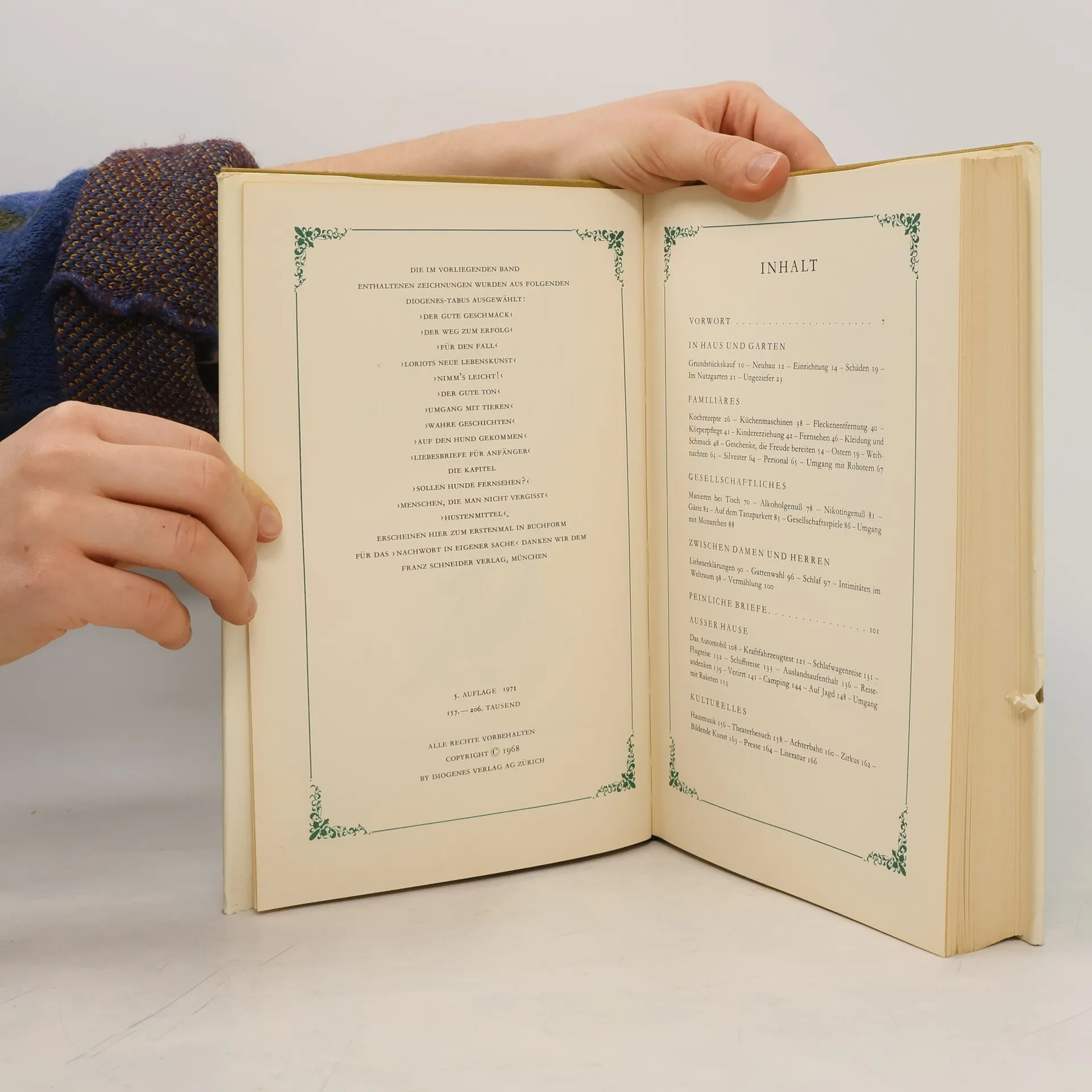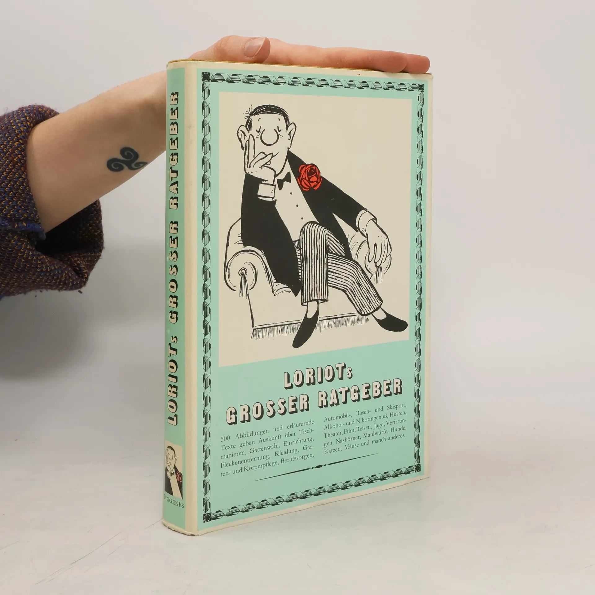 Ein Klassiker des modernen Lebens. Entstanden aus Loriots Gefühl der inneren Verpflichtung, »dem Menschen von heute ein Nachschlagewerk in die Hand zu geben, das ihm auch in kritischen Situationen korrektes Verhalten ermöglicht.« 500 Abbildungen und erläuternde Texte geben Auskunft über Tischmanieren, Gattenwahl, Einrichtung, Fleckenentfernung, Kleidung, Garten- und Körperpflege, Berufssorgen, Automobil-, Rasen- und Skisport, Alkohol- und Nikotingenuß, Husten, Theater, Film, Reisen, Jagd, Verirrungen, Nashörner, Maulwürfe, Hunde, Katzen, Mäuse und manch anderes mehr. Das unentbehrliche Kompendium für alle Haushaltungen.