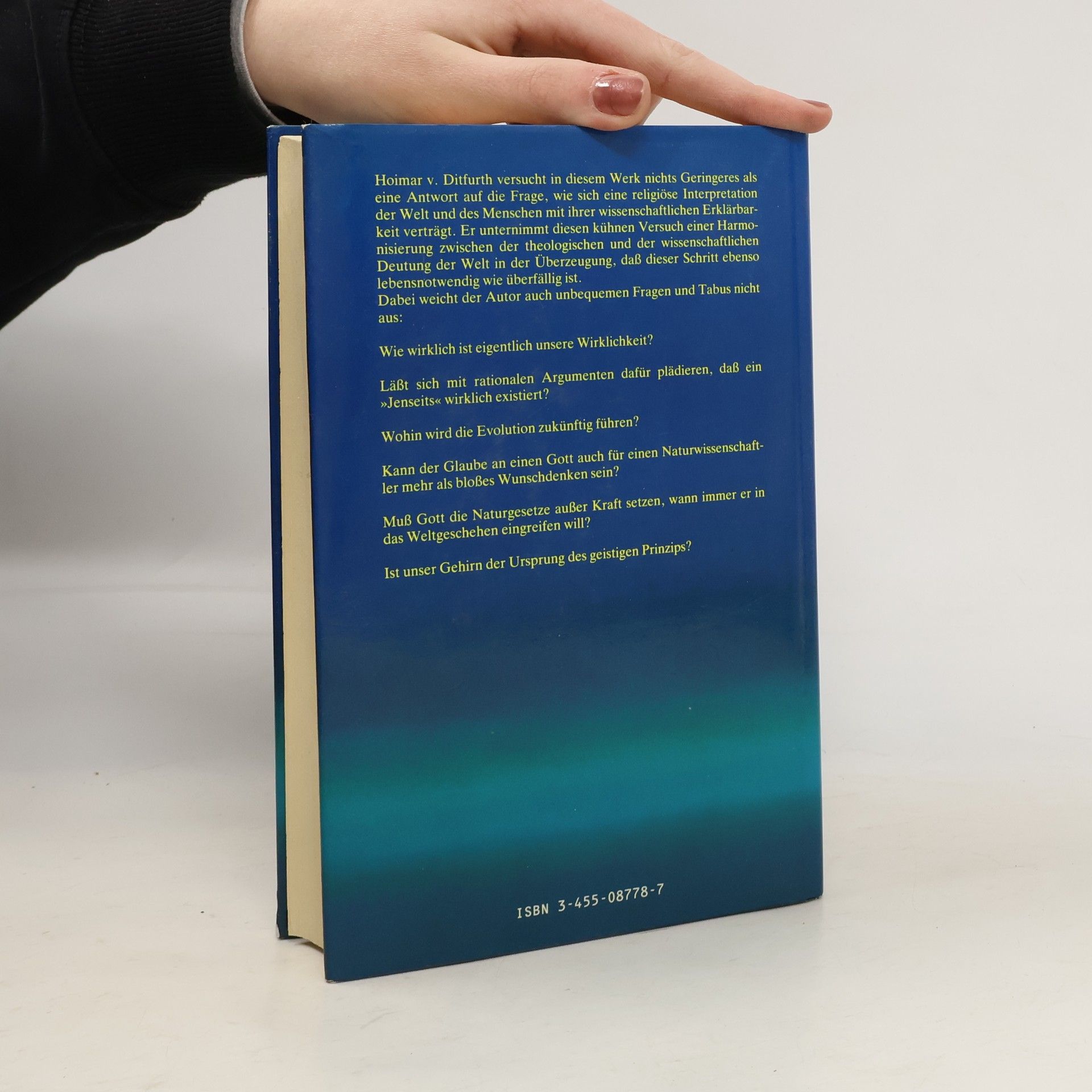 "Kann man an die Existenz oder gar an die tätige Anwesenheit eines Gottes in einem Universum glauben, das sich nach einigen Jahrhunderten naturwissenschaftlicher Forschung unserem Verstand als erklärbar zu präsentieren begonnen hat?" Mit dieser einfachen, aber für uns Menschen heute lebensnotwendigen Frage beschäftigt sich dieses Buch von Hoimar v. Ditfurth. Er versucht dabei nichts Geringeres, als die naturwissenschaftliche Deutung der Welt mit ihrer religiösen Interpretation zu verbinden. Ditfurth unternimmt diesen Versuch in der Überzeugung, daß der Brückenschlag zwischen theologischem und naturwissenschaftlichem Weltbild überfällig geworden und ohne fundamentale Widersprüche möglich ist. Im Zentrum seiner Darstellung steht dabei der für die moderne Naturwissenschaft grundlegende Gedanke der Evolution: "Bemerkenswerterweise liefert gerade dieses geistige Konzept einen entscheidenden Schlüssel zu einem besseren, in mancher Hinsicht ganz neuen Verständnis uralter theologischer Aussagen, bis hin zu der Behauptung von der Realität einer jenseitigen Wirklichkeit."