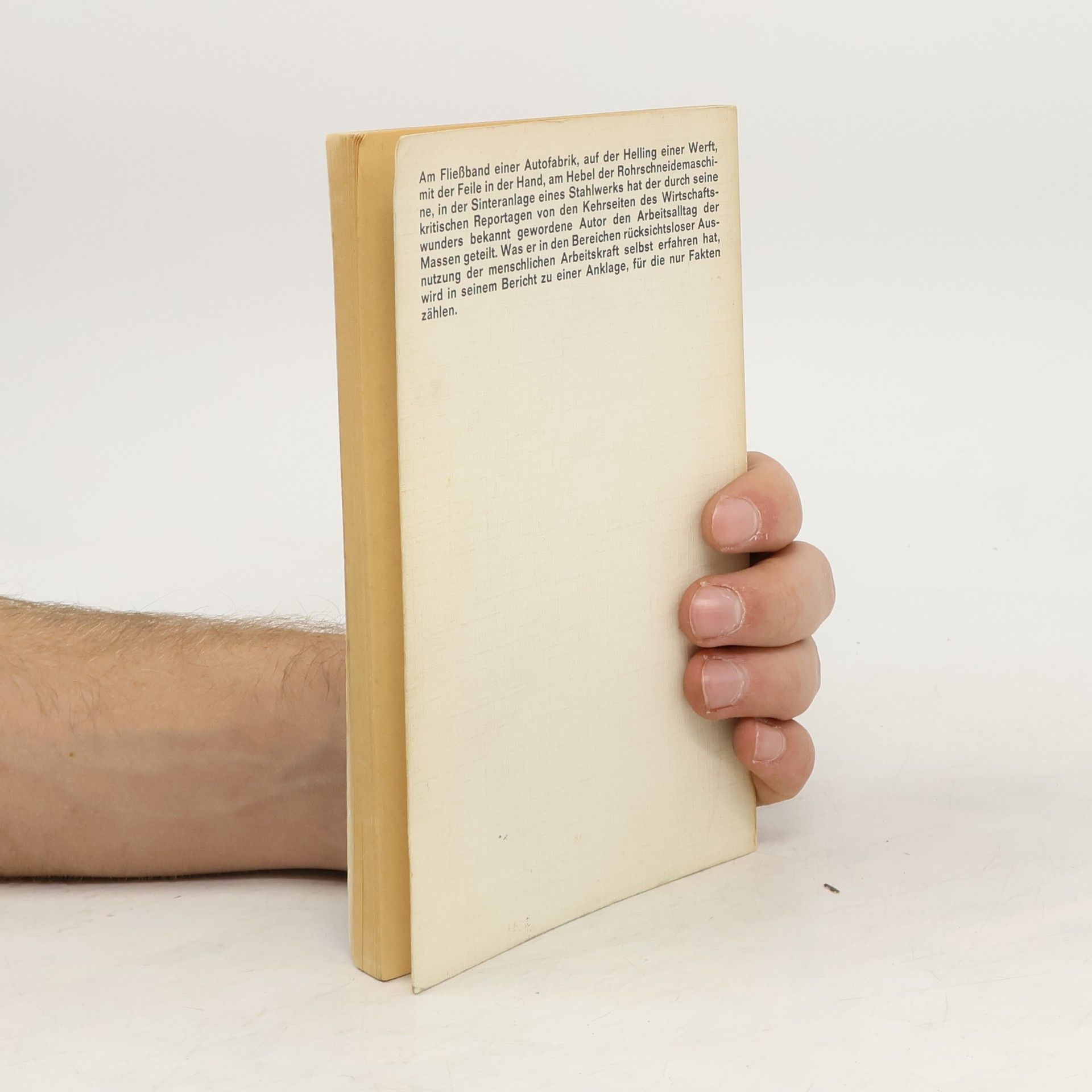 Als Hilfsarbeiter heuert Günter Wallraff zwischen 1963 und 1965 in verschiedenen Großbetrieben an: am Fließband bei Ford in Köln, im Akkord bei Siemens in München oder als Reiniger in Sinter zwo auf der August-Thyssen-Hütte in Duisburg-Hamborn. Zwischen Förderbändern, gigantischen Kesseln und rotierenden Kühlern, in Dreck und tosendem Lärm lernt er die Härte der industriellen Arbeitswelt am eigenen Leib kennen. Günter Wallraff, geboren 1942 in Burscheid bei Köln. Zuerst Buchhändler, dann Journalist und Schriftsteller. Heute engagiert er sich vor allem in Ostdeutschland gegen Rechtsradikalismus und Rassismus. Zahlreiche weitere Veröffentlichungen
