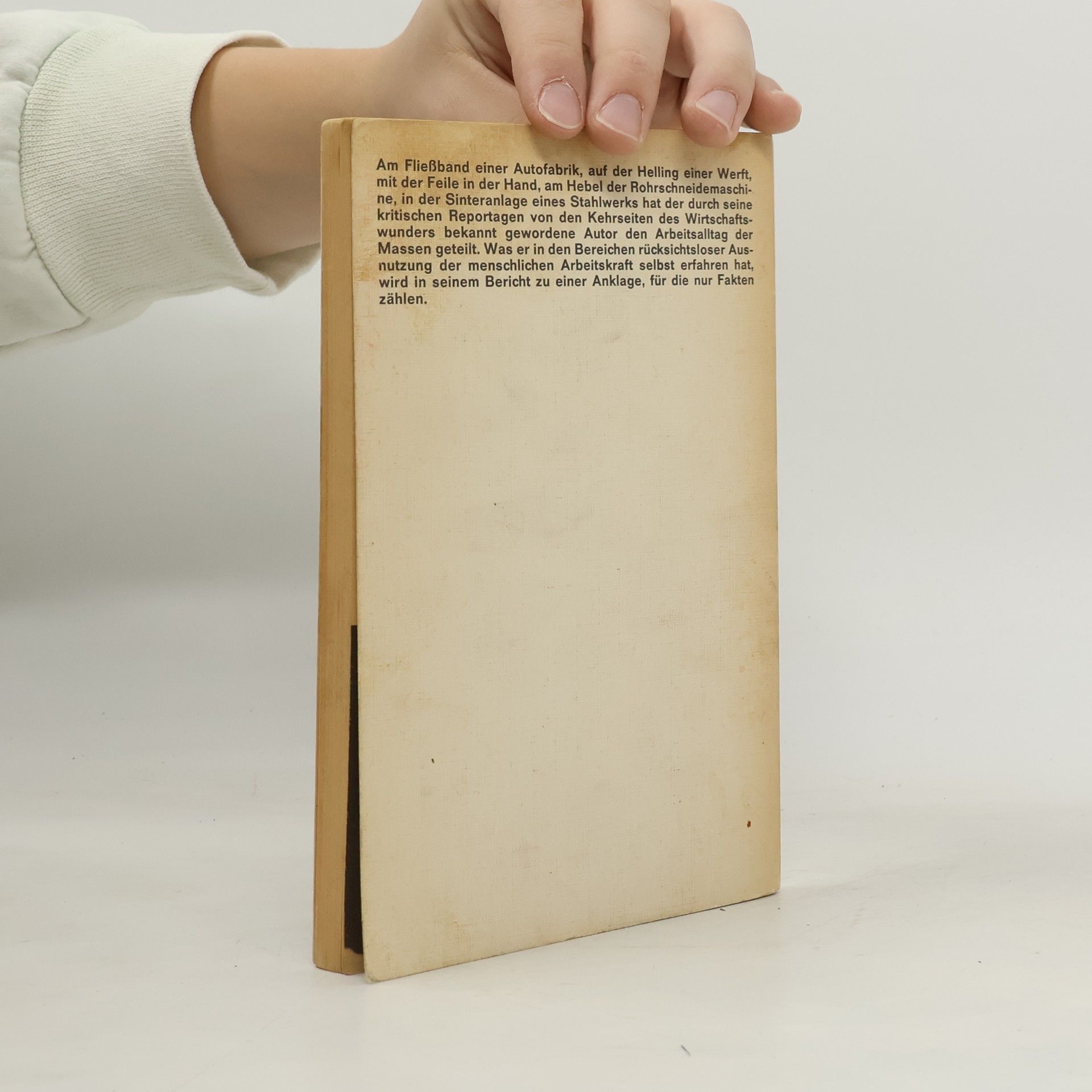 Als Hilfsarbeiter heuert Günter Wallraff zwischen 1963 und 1965 in verschiedenen Großbetrieben an: am Fließband bei Ford in Köln, im Akkord bei Siemens in München oder als Reiniger in Sinter zwo auf der August-Thyssen-Hütte in Duisburg-Hamborn. Zwischen Förderbändern, gigantischen Kesseln und rotierenden Kühlern, in Dreck und tosendem Lärm lernt er die Härte der industriellen Arbeitswelt am eigenen Leib kennen. Günter Wallraff, geboren 1942 in Burscheid bei Köln. Zuerst Buchhändler, dann Journalist und Schriftsteller. Heute engagiert er sich vor allem in Ostdeutschland gegen Rechtsradikalismus und Rassismus. Zahlreiche weitere Veröffentlichungen