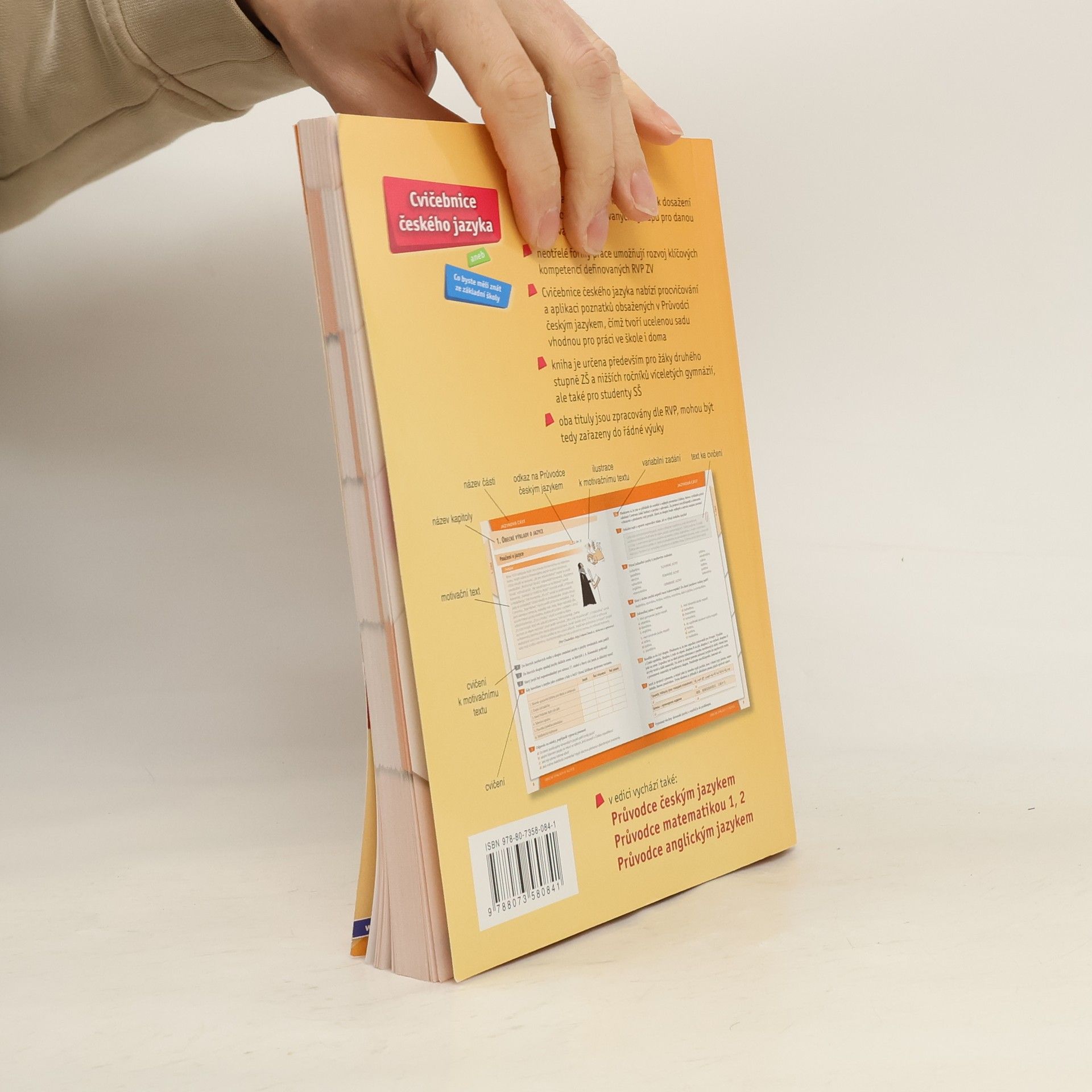 Titul obsahuje cvičení, která směřují k dosažení dovedností dle očekávaných výstupů pro vzdělávací oblast "Jazyk a jazyková komunikace". Neotřelé formy práce umožňují rozvoj klíčových kompetencí definovaných RVP ZV. Cvičebnice českého jazyka přináší úkoly k procvičování a aplikaci poznatků obsažených v Průvodci českým jazykem, čímž tvoří ucelenou sadu učebních materiálů vhodnou pro práci ve škole i doma.Publikace je zpracovaná podle RVP ZV, důraz klade zejména na získání praktických dovedností, dosažení očekávaných výstupů a rozvoj klíčových kompetencí. Kniha je rozdělena na tři hlavní části: jazykovou část, komunikační – slohovou část a pravopisnou část. Publikace je určená všem žákům druhého stupně základních škol a nižších tříd víceletých gymnázií. Taktéž je určena učitelům českého jazyka, kteří zde najdou bohatou zásobu cvičení, úloh a úkolů, které využijí ve svých hodinách (jediný titul tohoto charakteru na trhu, který se zaměřuje na rozvoj klíčových kompetencí a sleduje očekávané výstupy – plně v souladu s RVP ZV). Žáci i učitelé ocení cvičebnici nejen v hodinách českého jazyka, ale i při domácí přípravě na vyučování a také při přípravě na přijímací zkoušky na střední školy. Publikaci využijí i studenti a učitelé středních škol (zejména v nižších ročnících za účelem opakování látky, kterou by měli studenti znát ze základní školy).