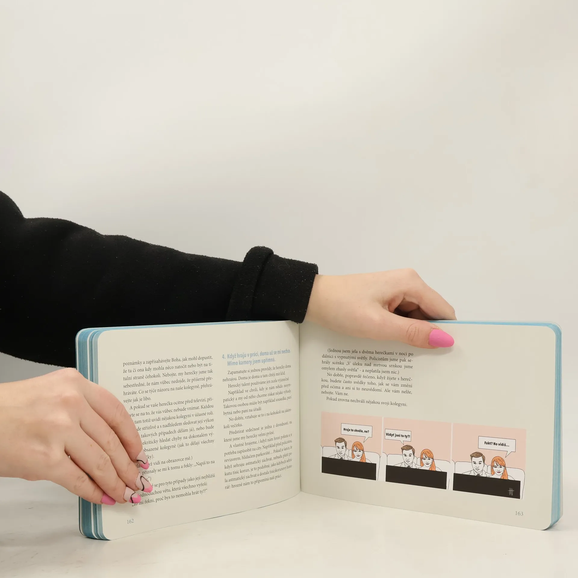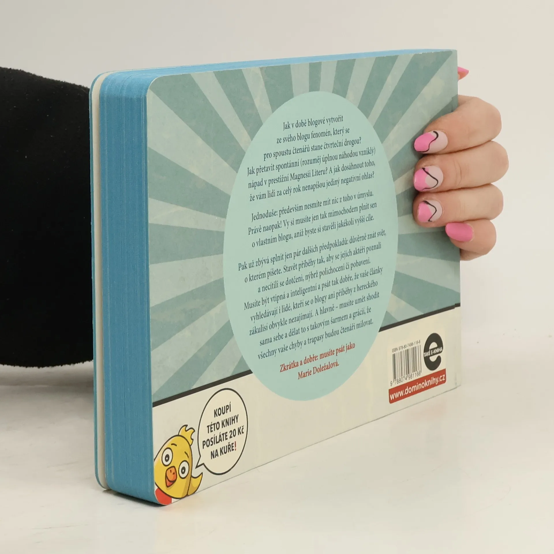 Jak v době blogové vytvořit ze svého blogu fenomén, který se pro zástupy čtenářů stane čtvrteční drogou? Jak přetavit spontánní (rozuměj úplnou náhodou vzniklý) nápad v prestižní Magnesii Literu? A jak dosáhnout toho, že vám lidi za celý rok nenapíšou jediný negativní ohlas? Jednoduše: především nesmíte mít nic z toho v úmyslu. Právě naopak! Vy musíte jen tak mimochodem uskutečňovat sen o vlastním blogu, aniž byste si stavěli jakékoli vyšší cíle. Pak už zbývá jen pár dalších předpokladů: důvěrně znát svět, o kterém píšete. Psát tak, aby se všichni aktéři popisovaných příhod poznali, a cítili se polichoceni či pobaveni, nikoli dotčeni. Musíte být vtipná a inteligentní a psát tak dobře, že vaše články vyhledávají i lidé, kteří by za jiných okolností žádný blog ani historky z hereckého zákulisí nikdy nečetli (ze zásady). A hlavně – musíte umět shodit sama sebe a dělat to s takovým šarmem a grácií, že všechny vaše chyby a trapasy budou čtenáři milovat. Zkrátka a dobře: musíte psát jako Marie Doležalová. A když se k tomu přidají geniální ilustrace Jana Hofmana, vznikne kniha, kterou prostě chcete mít. Kterou chcete dát jako dárek. Protože tahle kniha vám zvedne náladu tak jako žádná jiná!