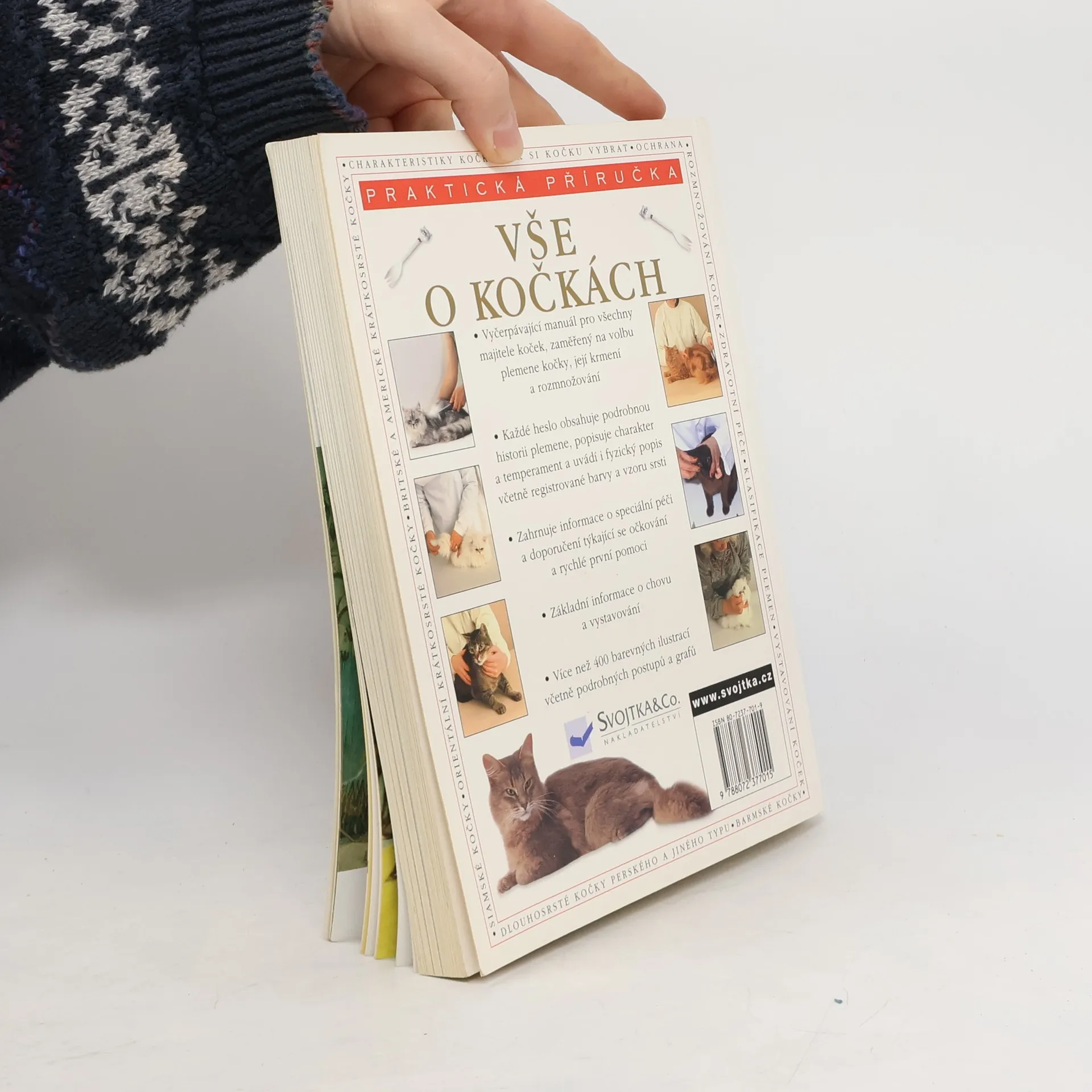 Vyčerpávající manuál pro všechny majitele koček, zaměřený na volbu plemene kočky, její krmení a rozmonožování. Každé heslo obsahuje podrobnou historii plemene, popisuje charakter a temperament a uvádí i fyzický popis včetně registrované barvy a vzoru srsti. Zahrnuje informace o speciální péči a doporučení týkající se očkování a rychlé první pomoci. Základní informace o chovu a vystavování. Více než 400 barevných ilustrací včetně podrobných postupů a grafů.