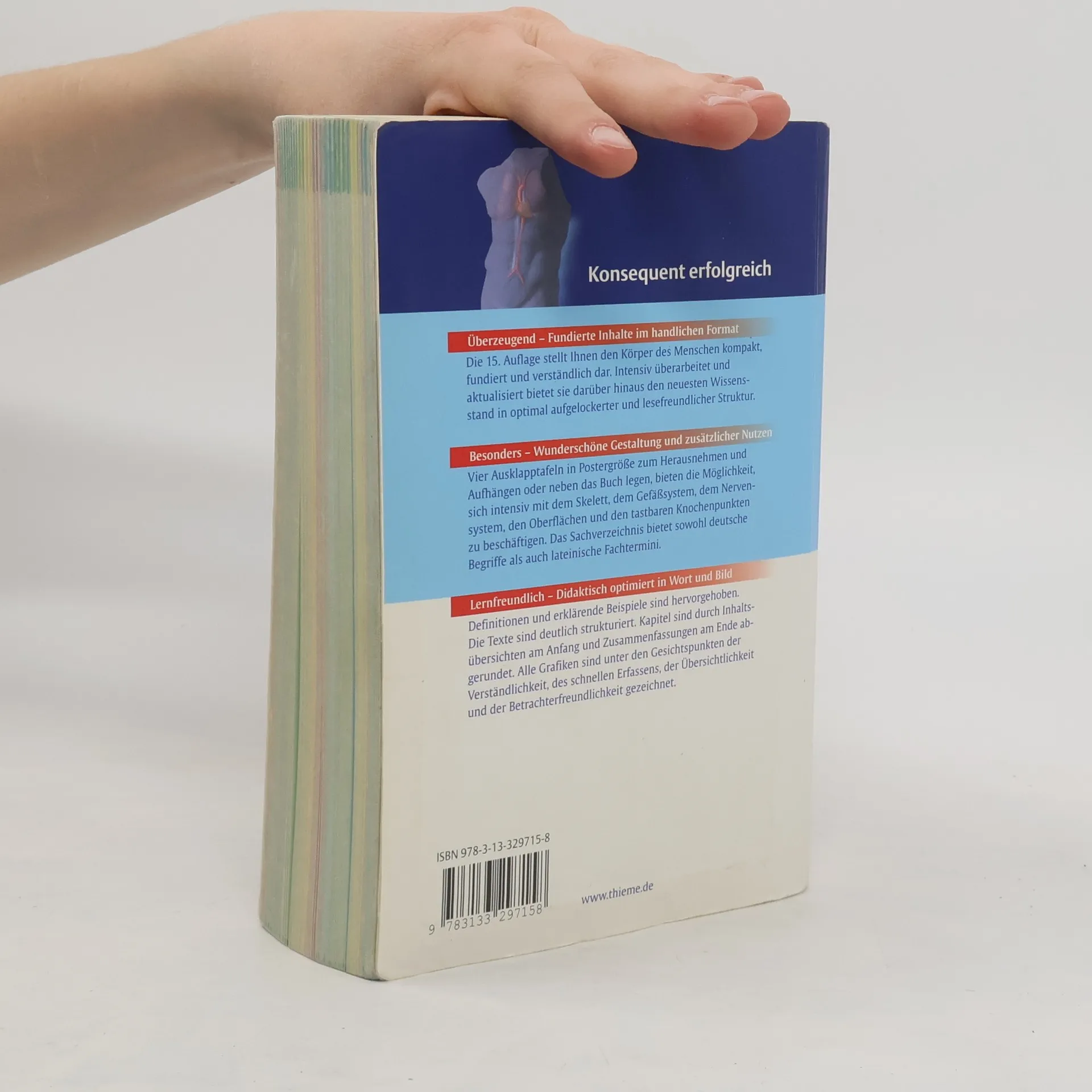 Fundierte Inhalte im handlichen Format Die 15. Auflage stellt den Körper des Menschen kompakt und verständlich dar. Intensiv überarbeitet und aktualisiert bietet sie darüber hinaus den neuesten Wissensstand in optimal aufgelockerter und lesefreundlicher Struktur. Grafiken im lernfreundlichen Posterformat Vier Ausklapptafeln in Postergröße zum Herausnehmen und Aufhängen oder neben das Buch legen, bieten die Möglichkeit, sich intensiv mit dem Skelett, dem Gefäßsystem, dem Nervensystem, den Oberflächen und den tastbaren Knochenpunkten zu beschäftigen. Das Sachverzeichnis bietet sowohl deutsche Begriffe als auch lateinische Fachtermini. Didaktisch optimiert in Wort und Bild Definitionen und erklärende Beispiele sind deutlich hervorgehoben. Die Texte sind leicht verständlich strukturiert. Kapitel sind durch Inhaltsübersichten am Anfang und Zusammenfassungen am Ende abgerundet. Alle Grafiken sind unter den Gesichtspunkten der Verständlichkeit, des schnellen Erfassens, der Übersichtlichkeit und der Betrachterfreundlichkeit gezeichnet.