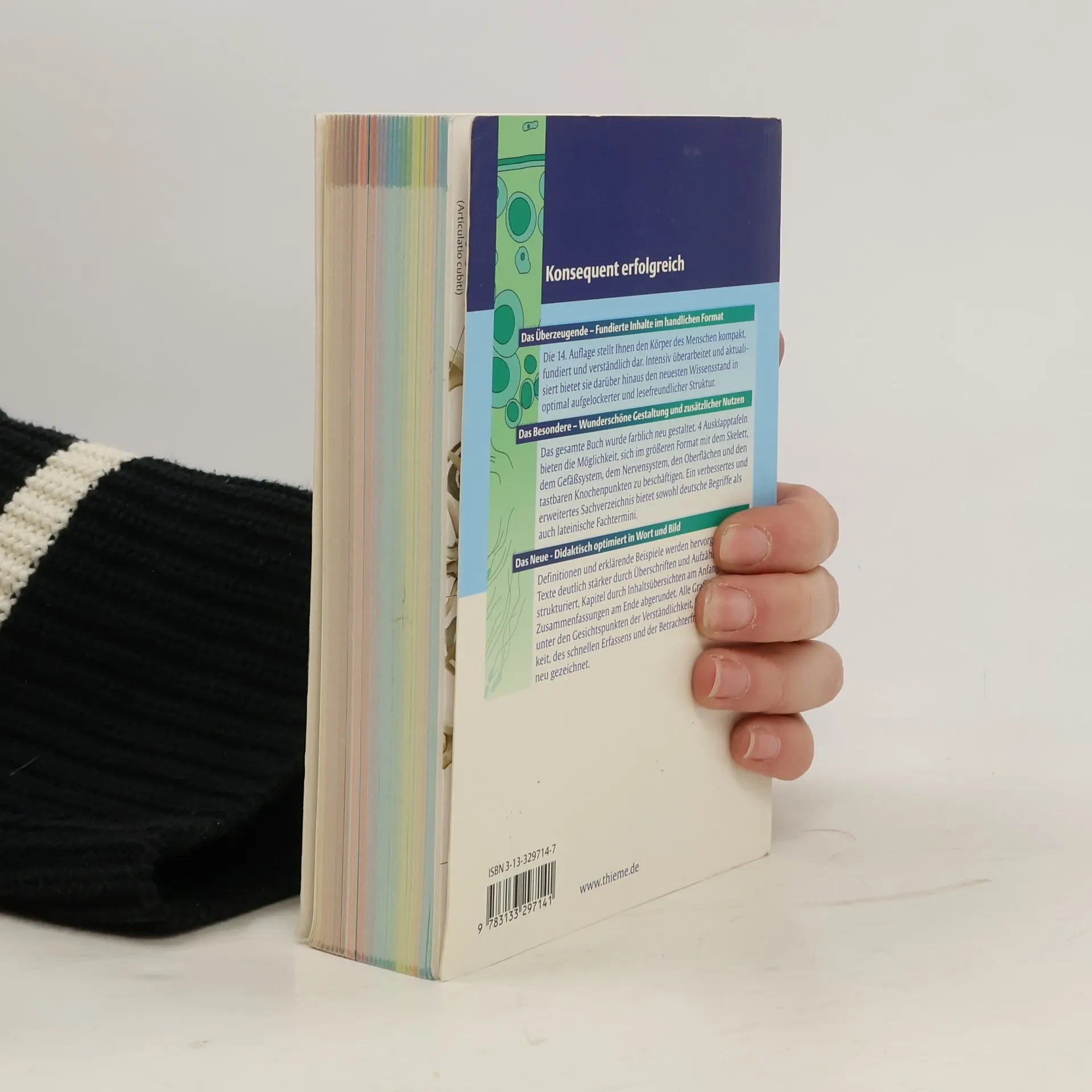 Fundierte Inhalte im handlichen Format Die 15. Auflage stellt den Körper des Menschen kompakt und verständlich dar. Intensiv überarbeitet und aktualisiert bietet sie darüber hinaus den neuesten Wissensstand in optimal aufgelockerter und lesefreundlicher Struktur. Grafiken im lernfreundlichen Posterformat Vier Ausklapptafeln in Postergröße zum Herausnehmen und Aufhängen oder neben das Buch legen, bieten die Möglichkeit, sich intensiv mit dem Skelett, dem Gefäßsystem, dem Nervensystem, den Oberflächen und den tastbaren Knochenpunkten zu beschäftigen. Das Sachverzeichnis bietet sowohl deutsche Begriffe als auch lateinische Fachtermini. Didaktisch optimiert in Wort und Bild Definitionen und erklärende Beispiele sind deutlich hervorgehoben. Die Texte sind leicht verständlich strukturiert. Kapitel sind durch Inhaltsübersichten am Anfang und Zusammenfassungen am Ende abgerundet. Alle Grafiken sind unter den Gesichtspunkten der Verständlichkeit, des schnellen Erfassens, der Übersichtlichkeit und der Betrachterfreundlichkeit gezeichnet.