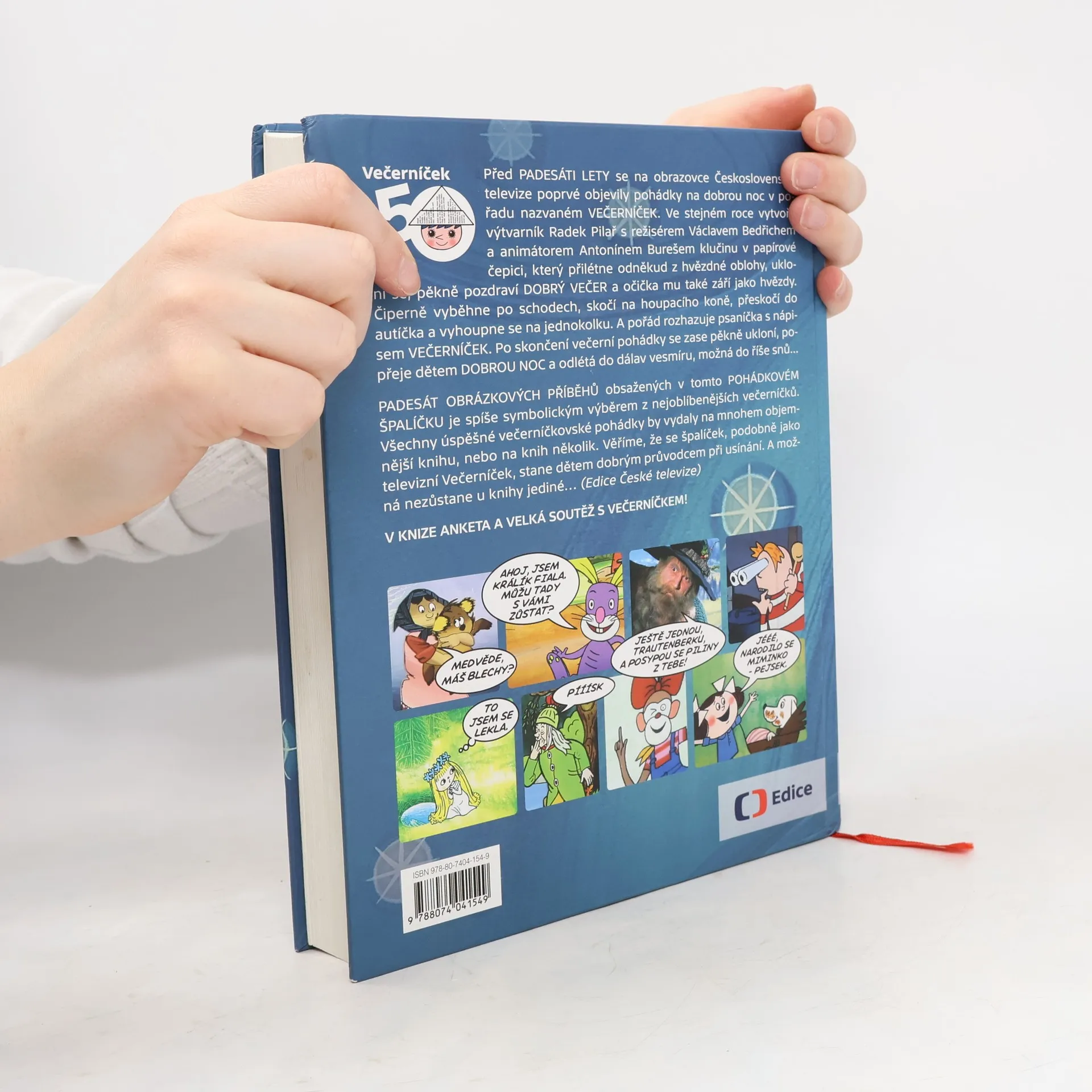 50 let Večerníčku - 50 obrázkových příběhů V knize anketa a velká soutěž s Večerníčkem! Před PADESÁTI LETY se na obrazovce Československé televize poprvé objevily pohádky na dobrou noc v pořadu nazvaném VEČERNÍČEK. Ve stejném roce se k pořadu přidal klučina v papírové čepici, který přilétne odněkud z hvězdné oblohy, ukloní se, mile pozdraví DOBRÝ VEČER a očička mu také září jako hvězdy. Čiperně vyběhne po schodech, skočí na houpacího koně, přeskočí do autíčka a vyhoupne se na jednokolku. A pořád rozhazuje psaníčka s nápisem VEČERNÍČEK. Po skončení večerní pohádky se zase pěkně ukloní, popřeje dětem DOBROU NOC a odlétá do dálav vesmíru, možná do říše snů... PADESÁT OBRÁZKOVÝCH PŘÍBĚHŮ obsažených v tomto POHÁDKOVÉM ŠPALÍČKU je spíše symbolickým výběrem z nejoblíbenějších večerníčků. Všechny úspěšné večerníčkovské pohádky by vydaly na mnohem objemnější knihu, nebo na knih několik. Prozatím ale postačí, když se tento svazek pohádek, podobně jako televizní Večerníček, stane dětem dobrým průvodcem při usínání. V KNIZE ANKETA A VELKÁ SOUTĚŽ S VEČERNÍČKEM!