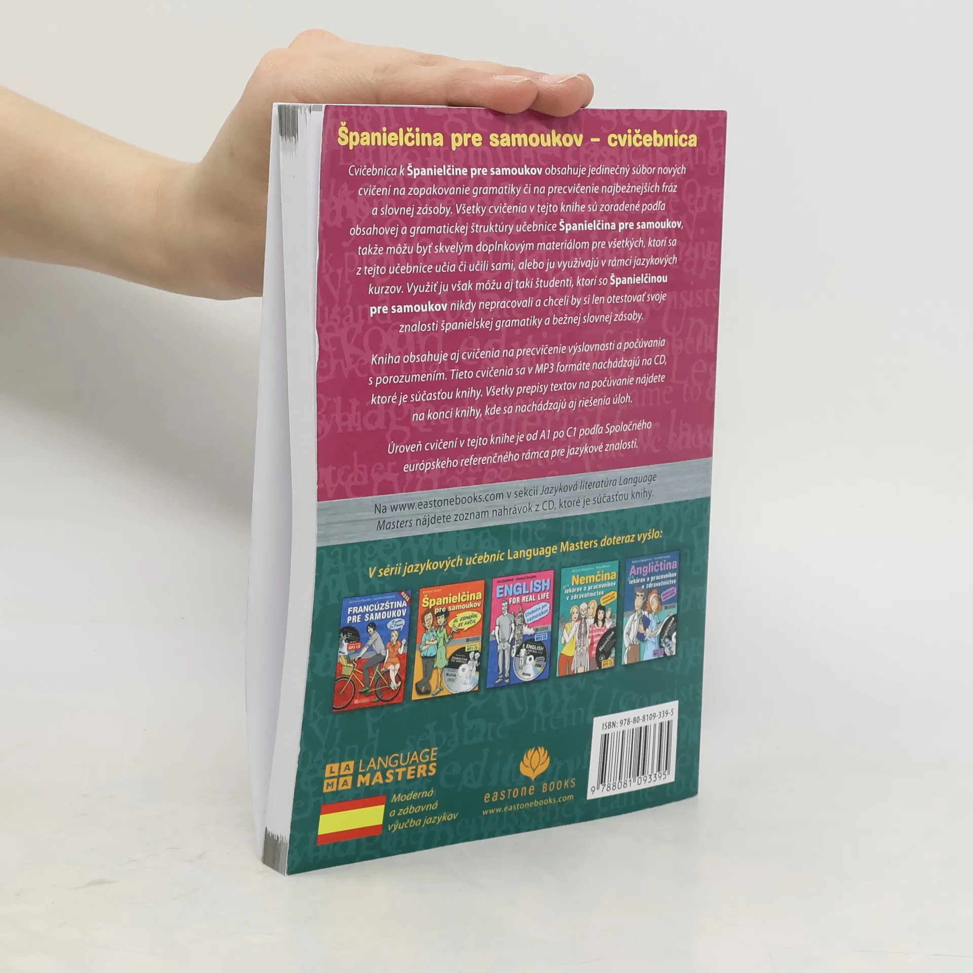 Cvičebnica k Španielčine pre samoukov obsahuje jedinečný súbor nových cvičení na zopakovanie gramatiky či na precvičenie najbežnejších fráz a slovnej zásoby. Všetky cvičenia v tejto knihe sú zoradené podľa obsahovej a gramatickej štruktúry učebnice Španielčina pre samoukov, takže môžu byť skvelým doplnkovým materiálom pre všetkých, ktorí sa z tejto učebnice učia či učili sami alebo ju využívajú v rámci jazykových kurzov. Využiť ju však môžu aj takí študenti, ktorí so Španielčinou pre samoukov nikdy nepracovali a chceli by si len otestovať svoje znalosti španielčiny. Kniha obsahuje aj cvičenia na precvičenie výslovnosti a počúvania s porozumením. Úroveň cvičení je od A1 po C1 podľa Spoločného európskeho rámca pre jazyky.