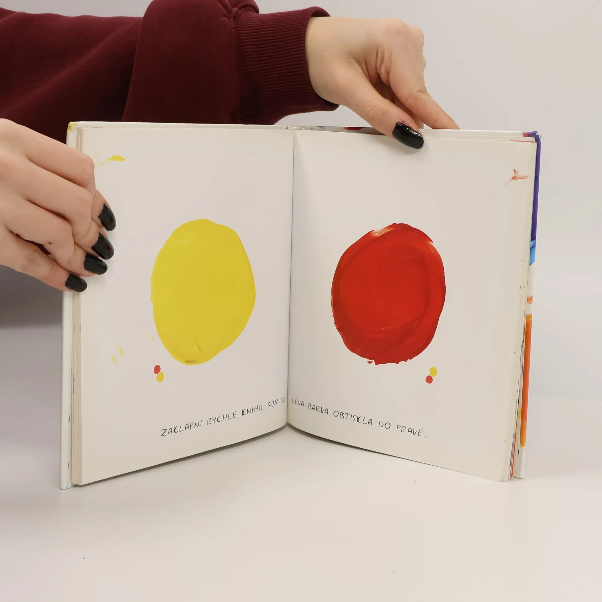 Nová kniha autora oblíbené Knížky nás originálním a hravým způsobem vtahuje do světa barev, jejich kombinací a míchání. Stránky plné barevných otisků prstů, skvrn a šmouh rozvíjejí dětskou představivost, vedou je k poznávání barev a možností jejich míchání a vybízejí k tomu, strávit s hravou knihou veselé chvíle.