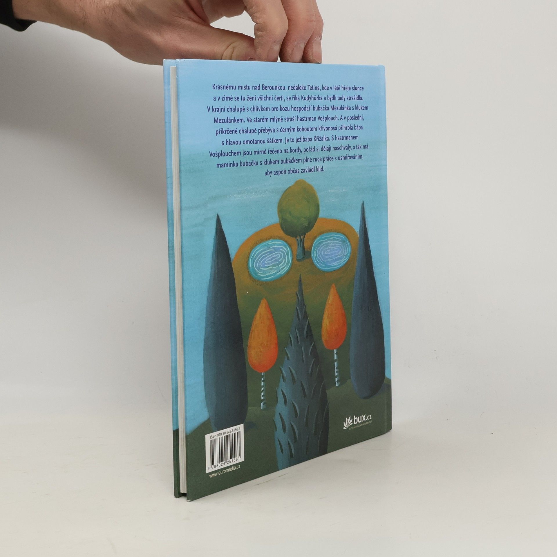 Na krásném místě nad Berounkou, nedaleko Tetína, kde v létě hřeje slunce a v zimě se tu žení všichni čerti, se říká Kudyhůrka a bydlí tady strašidla. V krajní chalupě s chlívkem na kozu hospodaří bubačka Mezulánka s klukem Mezulánkem. Ve starém mlýně straší hastrman Vošplouch. A v poslední, přikrčené chalupě sedí s černým kohoutem křivonosá přihrblá bába s hlavou omotanou šátkem. Je to ježibaba Křížalka. S hastrmanem Vošplouchem jsou mírně řečeno na kordy, pořád si dělají naschvály. Maminka bubačka s klukem bubáčkem mají plné ruce práce s usmiřováním, aby aspoň občas zavládl klid… Půvabné pohádky od Berounky, ilustrované autorem.