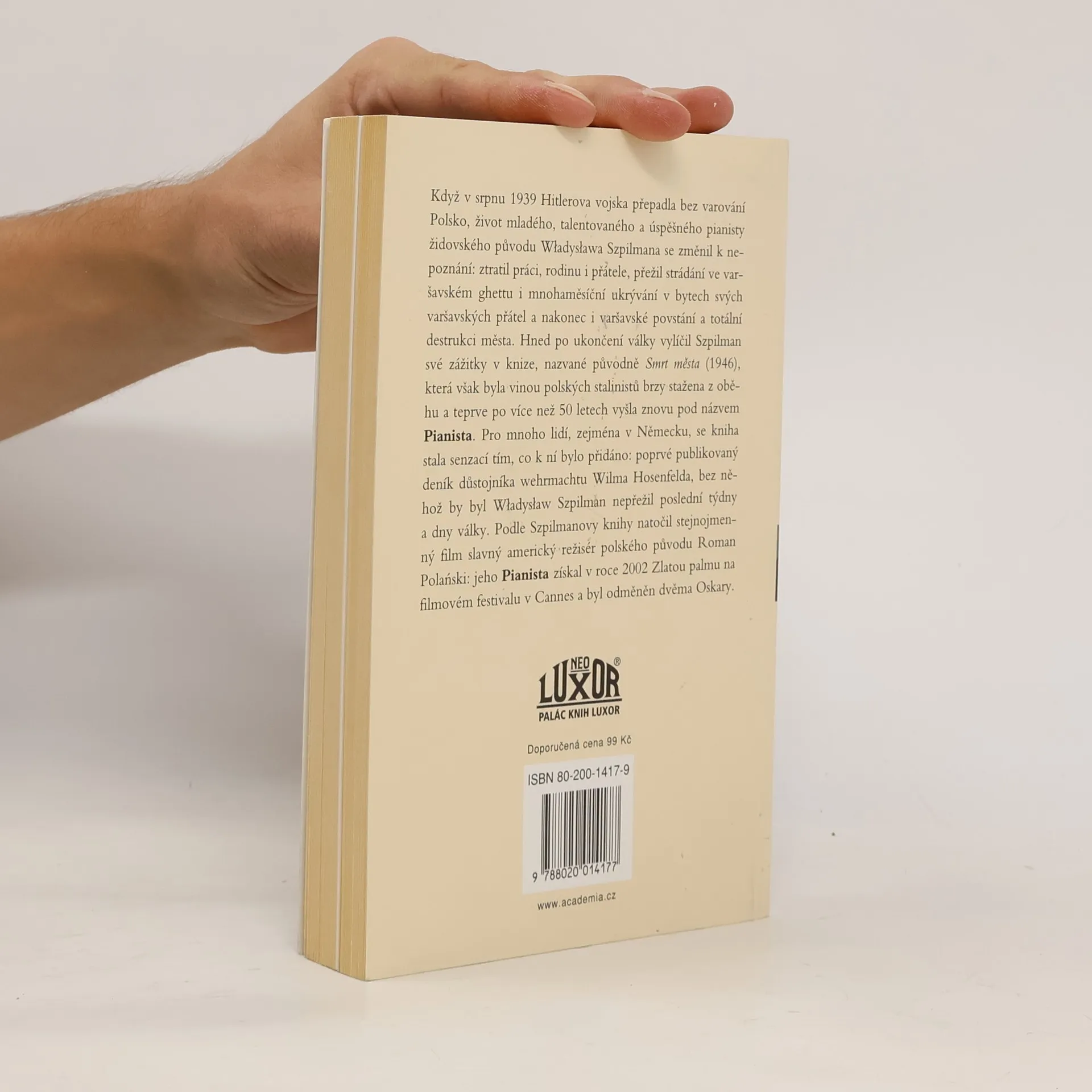 ISBN 978-80-200-1417-7 (dotisk 2007 ; brož.) Když v srpnu 1939 Hitlerova vojska přepadla bez varování Polsko, život mladého, talentovaného a úspěšného pianisty židovského původu Władysława Szpilmana se změnil k nepoznání: ztratil práci, rodinu i přátele, přežil strádání ve varšavském ghettu i mnohaměsíční ukrývání v bytech svých varšavských přátel a nakonec i varšavské povstání a totální destrukci města. Hned po ukončení války vylíčil Szpilman své zážitky v knize, nazvané původně Smrt města (1946), která však byla vinou polských stalinistů brzy stažena z oběhu a teprve po více než 50 letech vyšla znovu pod názvem Pianista. Pro mnoho lidí, zejména v Německu, se kniha stala senzací tím, co k ní bylo přidáno: poprvé publikovaný deník důstojníka wehrmachtu Wilma Hosenfelda, bez něhož by byl Władysław Szpilman nepřežil poslední týdny a dny války. Podle Szpilmanovy knihy natočil stejnojmenný film slavný americký režisér polského původu Roman Polański: jeho Pianista získal v roce 2002 Zlatou palmu na filmovém festivalu v Cannes a byl odměněn dvěma Oskary.