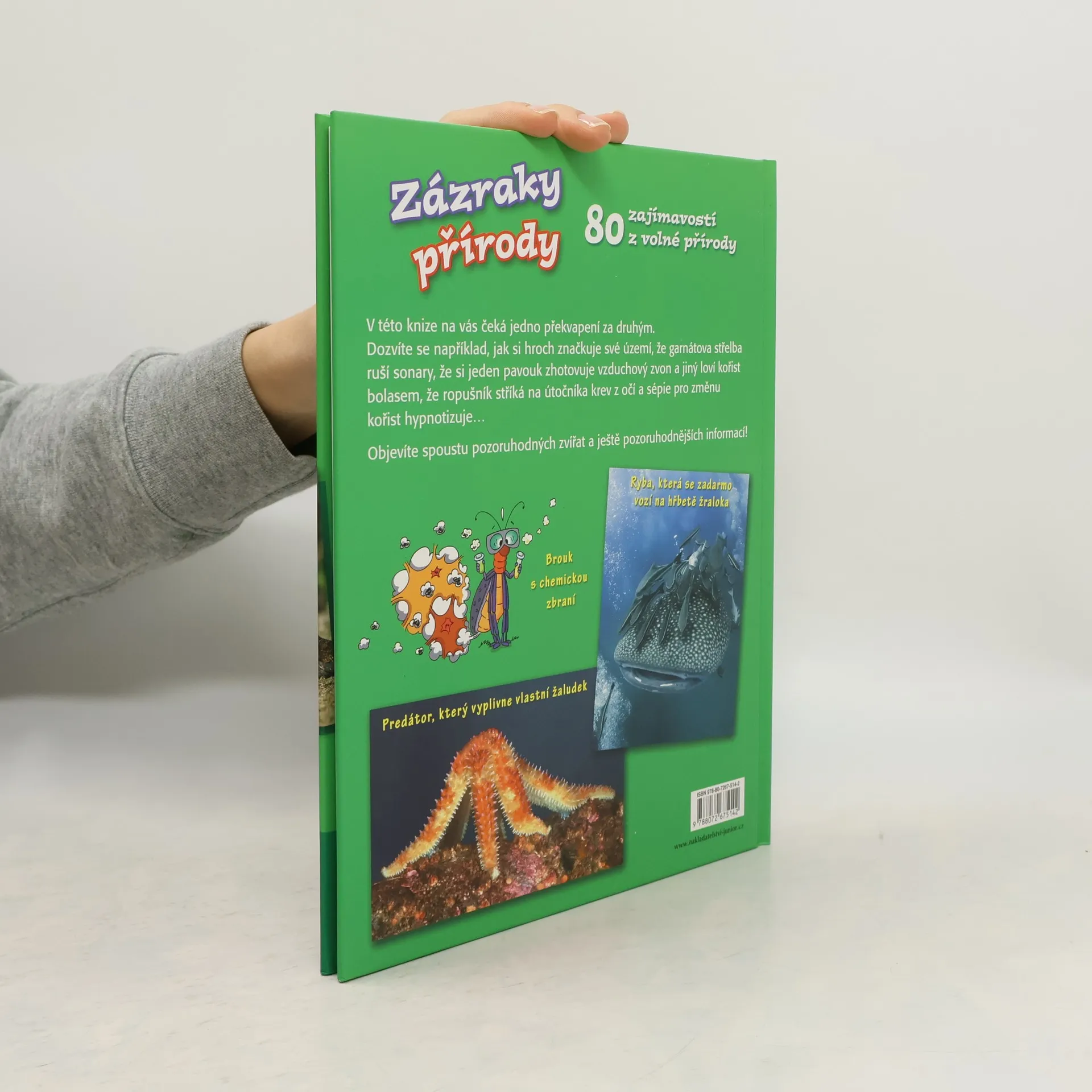 V této knize na vás čeká jedno překvapení za druhým. Dozvíte se například, jak si hroch značkuje své území, že garnátova střelba ruší sonary, že si jeden pavouk tká vzduchový zvon a jiný loví kořist bolasem, že ropušník stříká na útočníka krev z očí a sépie pro změnu kořist hypnotizuje… Objevíte spoustu pozoruhodných zvířat a ještě pozoruhodnějších informací! Kniha je určena malým školákům.