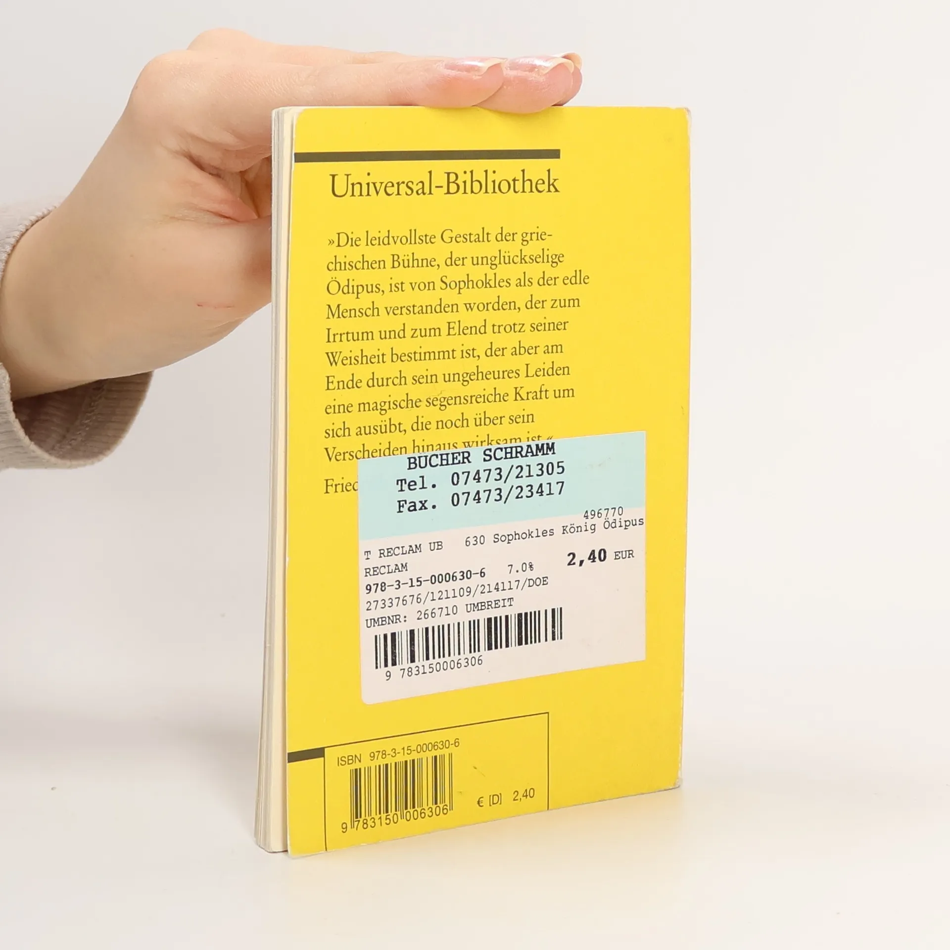 "Die leidvollste Gestalt der griechischen Bühne, der unglückselige Ödipus, ist von Sophokles als der edle Mensch verstanden worden, der zum Irrtum und zum Elend trotz seiner Weisheit bestimmt ist, der aber am Ende durch sein ungeheures Leiden eine magische segensreiche Kraft um sich ausübt, die noch über sein Verscheiden hinaus wirksam ist." (Friedrich Nietzsche, Klappentext)