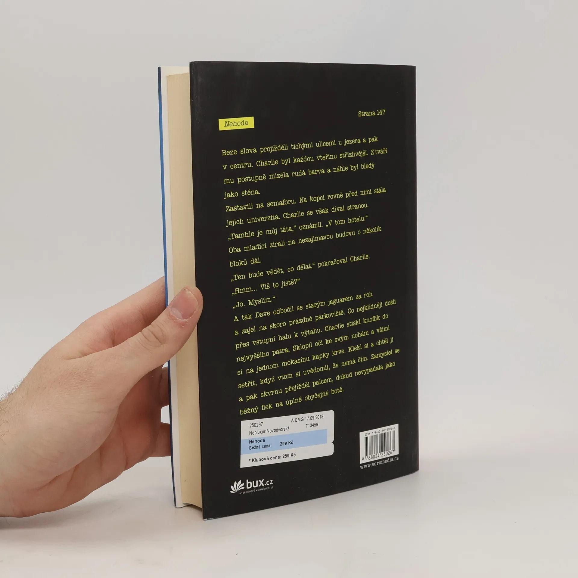 „Pokud milujete nervy drásající příběhy, letos jsem žádný lepší než tenhle nečetl.“ Stephen King Na začátku byl rukopis. Anonymní příběh nazvaný Nehoda. Kdokoli si ho přečetl, okamžitě věděl, že tenhle text změní svět. Že tomu, kdo ho vydá, přinese obrovský zisk. Ale kdokoli zná jeho obsah, ten se rázem dostává do smrtelného nebezpečí – a morálního konfliktu. Newyorská literární agentka Isabel Reedová či Hayden Grey, zástupce CIA v Kodani, o tom vědí své. A pak je tu pochopitelně autor, ukrytý v Curychu a čekající, až jeho kniha vyjde... Nehoda odkrývá ledacos ze života mocných a vlivných lidí. Putuje napříč vydavatelstvími a zachraňuje či ničí kariéry a společnosti. A donutí každého konfrontovat své představy o sobě se svým skutečným já. Nehoda je nový působivý, důmyslný a mnohovrstevný thriller Chrise Pavoneho (držitele prestižních cen Edward Award a Anthony Award za debut Bez domova). Thriller, před nímž neutečete – nebo uděláte velkou chybu.