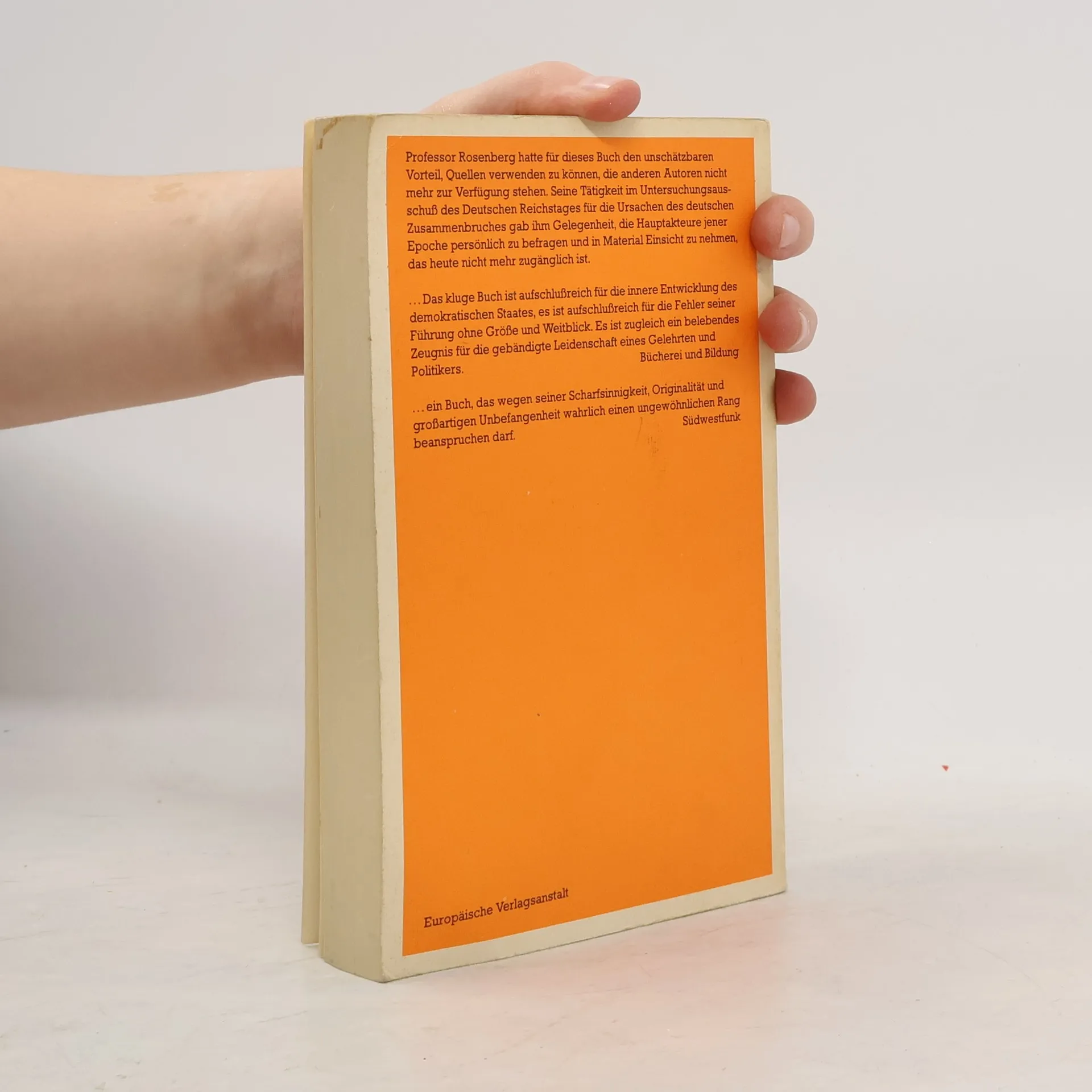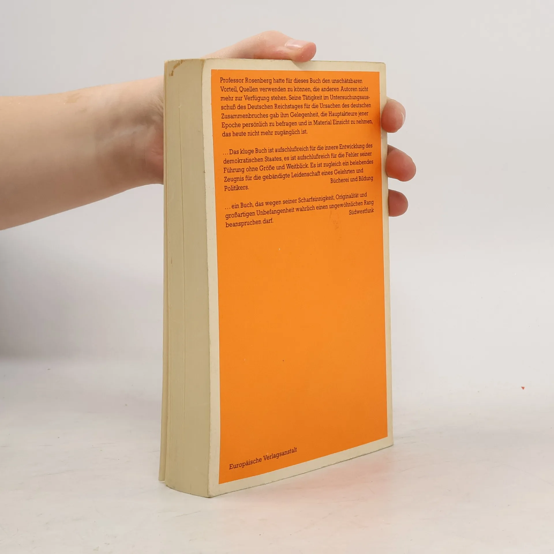 Arthur Rosenbergs „Entstehung der Weimarer Republik“ gilt seit Erscheinen als Standardwerk. Hier ist der seltene Glücksumstand eingetreten, dass ein Fachhistoriker von Rang eine Epoche beschreibt, in der er selbst politisch tätig gewesen ist. Arthur Rosenberg hatte für dieses Buch den unschätzbaren Vorteil, Quellen verwenden zu können, die anderen Autoren nicht mehr zur Verfügung stehen. Seine Tätigkeit im Untersuchungsausschuß des Deutschen Reichstags für die Ursachen des deutschen Zusammenbruchs gab ihm die Gelegenheit, die Hauptakteure jener Epoche persönlich zu befragen und in Material Einsicht zu nehmen, das heute nicht mehr zugänglich ist. Seine Darstellung des ersten Versuchs, die Demokratie in Deutschland heimisch zu machen, der so unheilvoll scheiterte, ist ein Stück klassischer Geschichtsschreibung, die durch nichts, was später geschrieben wurde, überflüssig wird.