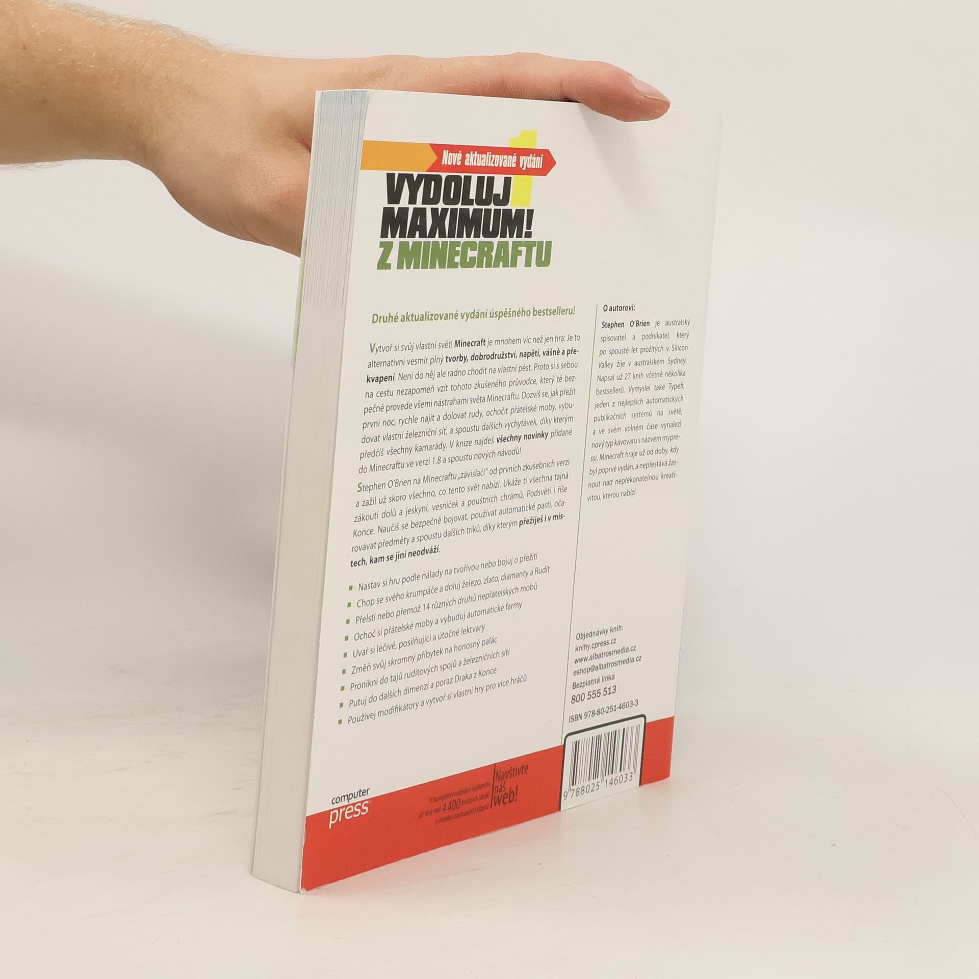 Druhé aktualizované vydání úspěšného bestselleru! Minecraft je víc než jen hra; je to alternativní vesmír plný tvorby a dobrodružství. Na cestu do tohoto světa si nezapomeň vzít zkušeného průvodce, který tě provede nástrahami Minecraftu. Naučíš se, jak přežít první noc, efektivně těžit rudy, ochočit přátelské moby a vybudovat železniční síť. Kniha obsahuje novinky z verze 1.8 a spoustu nových návodů. Stephen O’Brien, který hraje od prvních zkušebních verzí, ti ukáže tajná zákoutí dolů, vesniček a chrámů, stejně jako Podsvětí a říši Konce. Získáš dovednosti v boji, používání automatických pastí a očarovávání předmětů, což ti pomůže přežít i v nebezpečných oblastech. * Přizpůsob si hru na tvořivou nebo přežití * Těž železo, zlato, diamanty a rudy * Přelsti nebo přemož 14 druhů nepřátelských mobů * Ochoč si přátelské moby a vybuduj automatické farmy * Uvař si léčivé a útočné lektvary * Přeměň svůj příbytek na palác * Objev ruditové spojení a železniční sítě * Putuj do dalších dimenzí a poraz Draka z Konce * Vytvářej vlastní hry pro více hráčů s modifikátory.