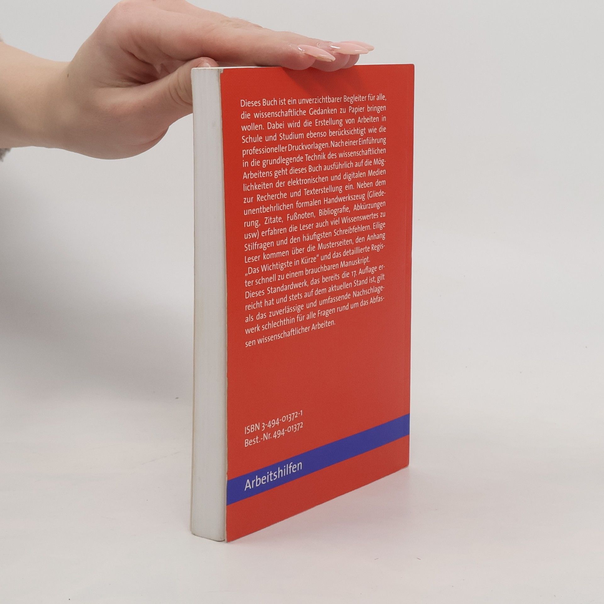 Dieses Buch ist ein unverzichtbarer Begleiter für alle, die wissenschaftliche Gedanken zu Papier bringen wollen. Dabei wird die Erstellung von Arbeiten in Schule und Studium ebenso berücksichtigt wie die professioneller Druckvorlagen. Nach einer Einführung in die grundlegende Technik des wissenschaftlichen Arbeitens geht dieses Buch ausführlich auf die Möglichkeiten der elektronischen und digitalen Medien zur Recherche und Texterstellung ein. Neben dem unentbehrlichen formalen Handwerkszeug (Gliederung, Zitate, Fußnoten, Bibliografie, Abkürzungen usw) erfahren die Leser auch viel Wissenswertes zu Stilfragen und den häufigsten Schreibfehlern. Eilige Leser kommen über die Musterseiten, den Anhang „Das Wichtigste in Kürze“ und das detaillierte Register schnell zu einem brauchbaren Manuskript.