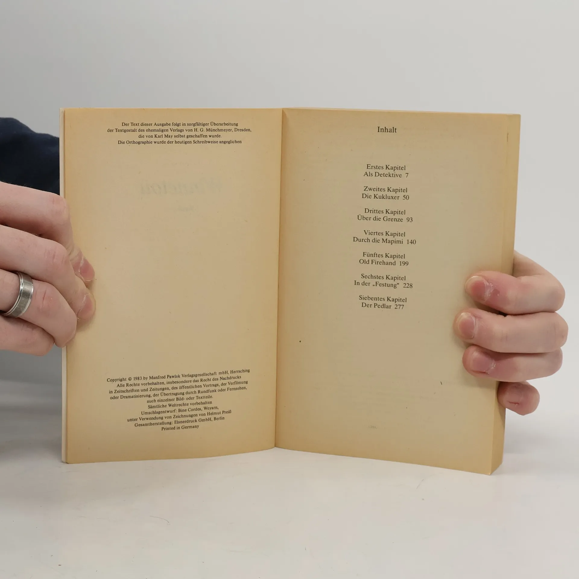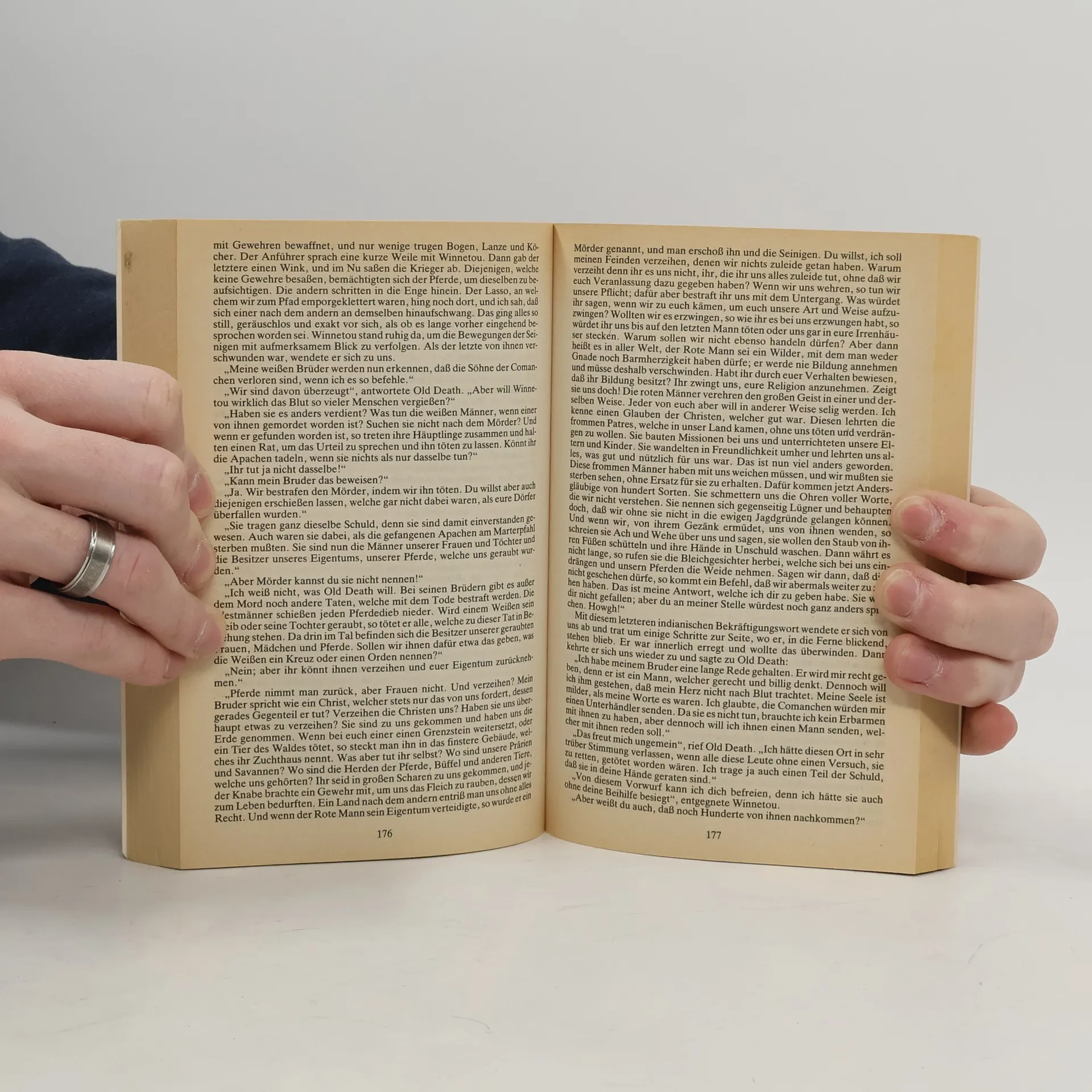 Der Leser erfährt, wie der Ich-Erzähler zum berühmten Westmann Old Shatterhand wird und die Freundschaft des edlen Apatschen Winnetou erringt. Das tragische Schicksal Nscho-tschis verleiht dieser Geschichte jenen Hauch von Schwermut, der über dem verzweifelten Todesringen der roten Rasse liegt.