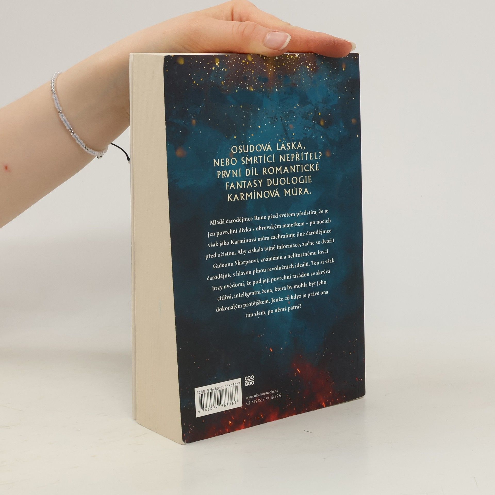 Osudová láska, nebo smrtící nepřítel? První díl romantické fantasy duologie. Mladá čarodějnice Rune před světem předstírá, že je jen povrchní dívka s obrovským majetkem – po nocích však jako Karmínová můra zachraňuje jiné čarodějnice před očistou. Aby získala tajné informace, začne se dvořit Gideonu Sharpeovi, známému a nelítostnému lovci čarodějnic s hlavou plnou revolučních ideálů. Ten si však brzy uvědomí, že pod její povrchní fasádou se skrývá citlivá, inteligentní žena, která by mohla být jeho dokonalým protějškem. Jenže co když je právě ona tím zlem, po němž pátrá?