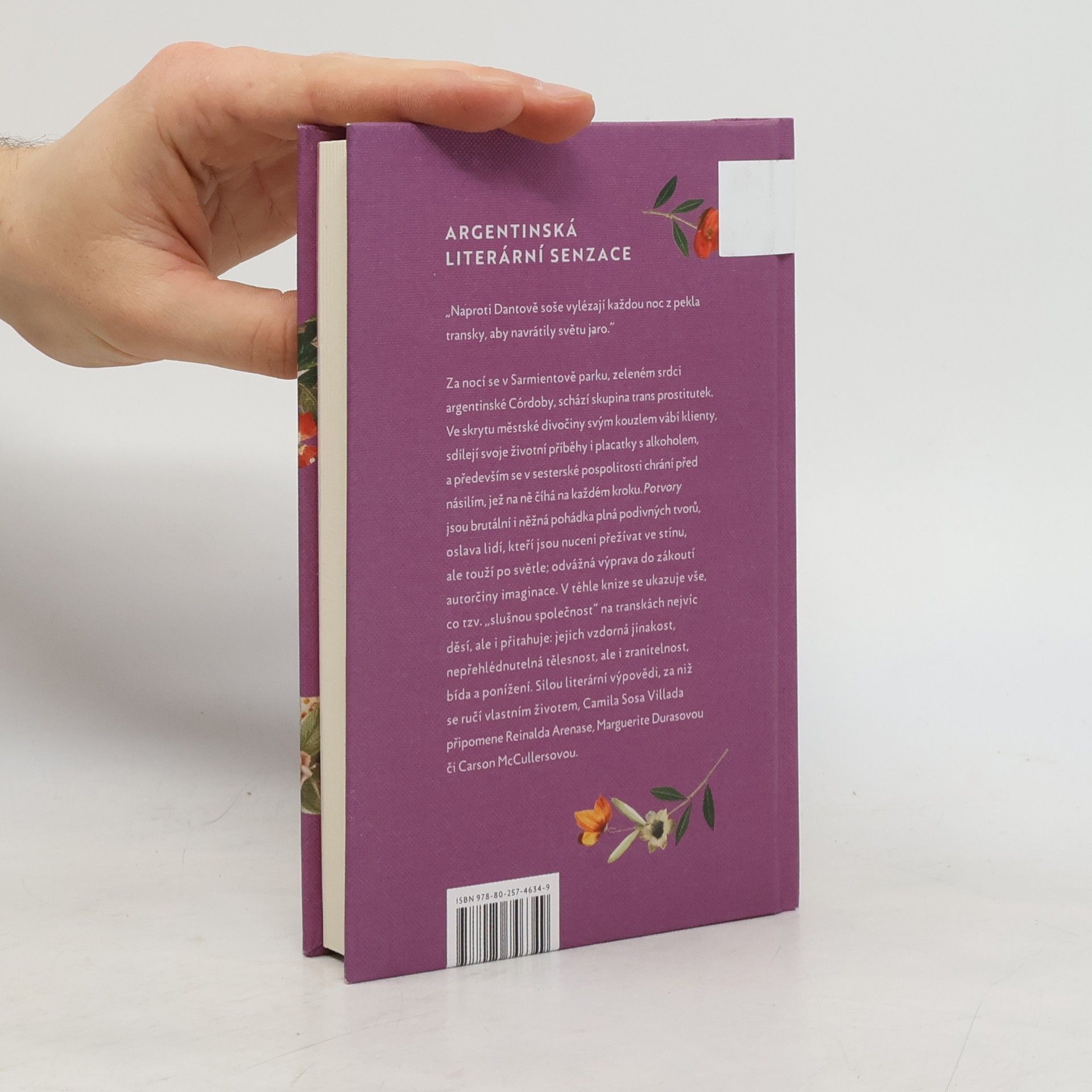 Za nocí se v Sarmientově parku, zeleném srdci argentinské Córdoby, schází skupina trans prostitutek. Ve skrytu městské divočiny svým kouzlem vábí klienty, sdílejí svoje životní příběhy i placatky s alkoholem, a především se v sesterské pospolitosti chrání před násilím, jež na ně číhá na každém kroku. Potvory jsou brutální i něžná pohádka plná podivných tvorů, oslava lidí, kteří jsou nuceni přežívat ve stínu, ale touží po světle; odvážná výprava do zákoutí autorčiny imaginace. V téhle knize se ukazuje vše, co tzv. „slušnou společnost“ na transkách nejvíc děsí, ale i přitahuje: jejich vzdorná jinakost, nepřehlédnutelná tělesnost, ale i zranitelnost, bída a ponížení. Silou literární výpovědi, za niž se ručí vlastním životem, Camila Sosa Villada připomene Reinalda Arenase, Marguerite Durasovou či Carson McCullersovou.