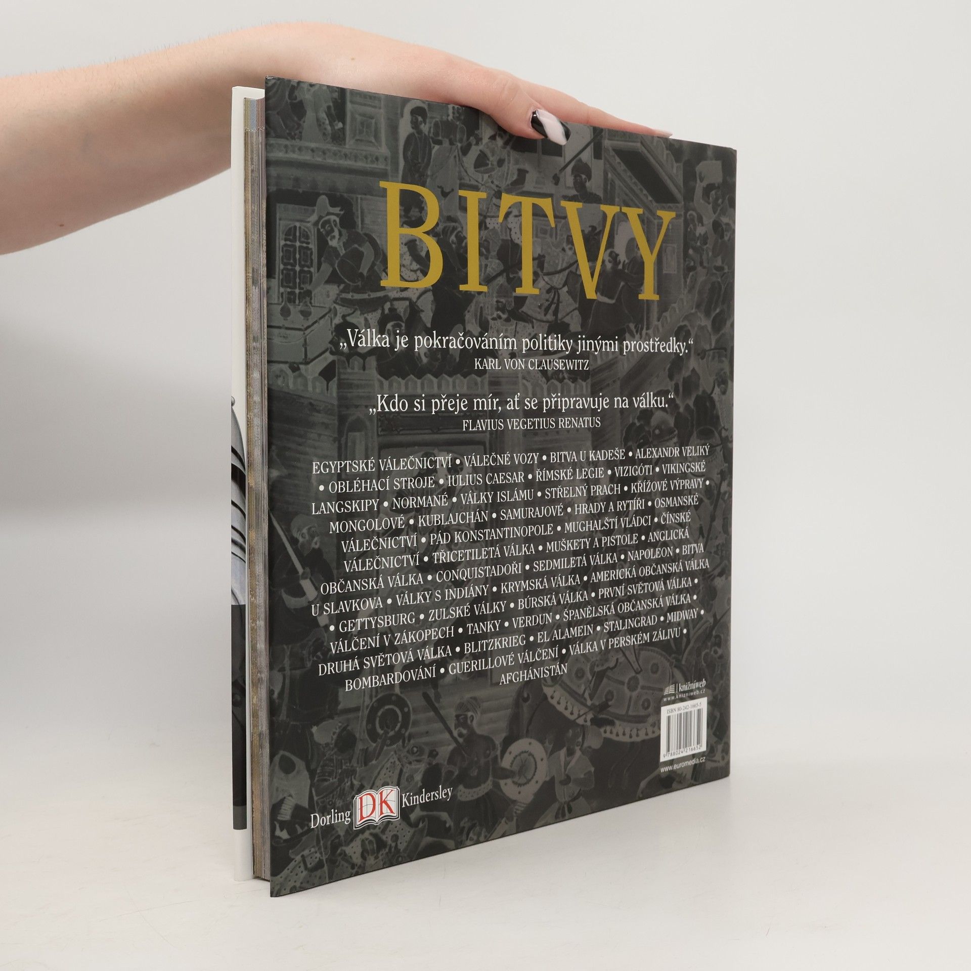 Válčení je tak staré jako dějiny lidstva. Jeho vývoj můžeme sledovat od prvních zaznamenaných bitev Egypťanů až k moderní éře hrozby úplného zničení. Výpravná encyklopedie Bitvy je uceleným a skvěle obrazově dokumentovaným záznamem mimořádného, avšak krvavého příběhu dějin válečnictví. Představuje nejen vyčerpávající kroniku legendárních bitev, slavných vojevůdců a pamětihodných činů, ale poskytuje i podrobné informace o používaných zbraních a dobové vojenské technice. (5000 let válčení)