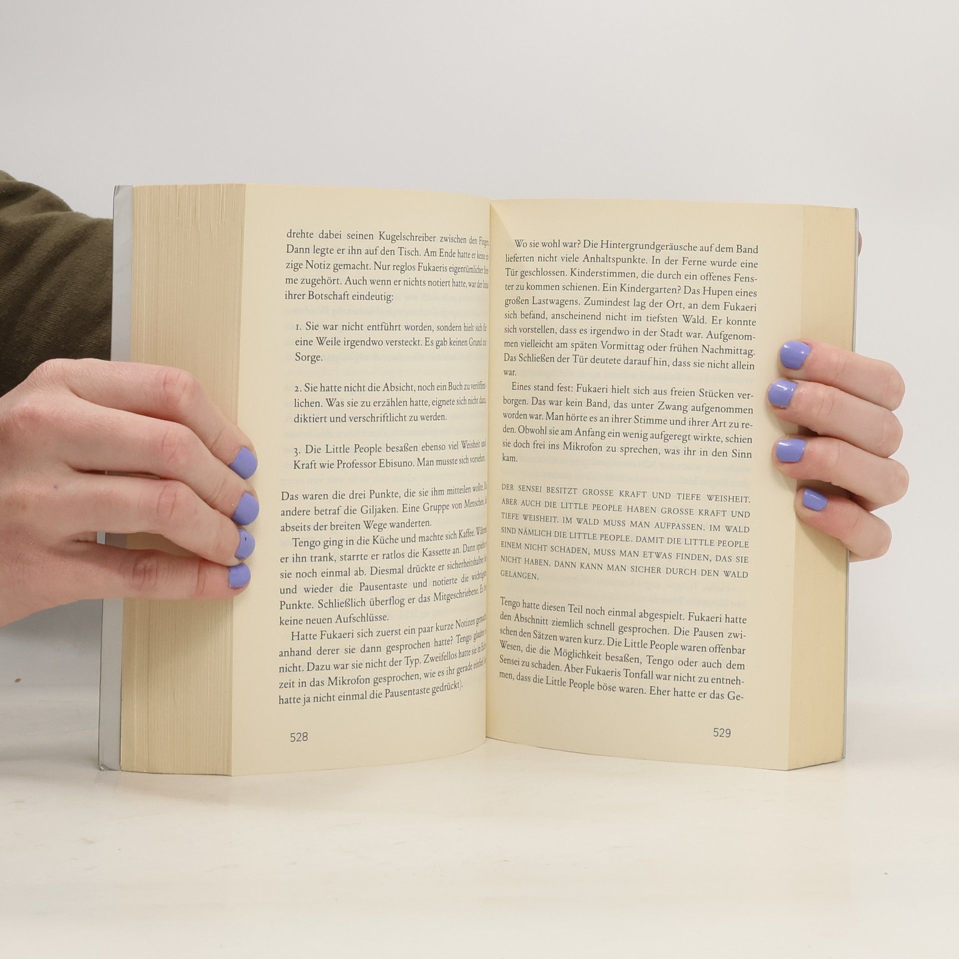1984. Aomame hat zwei verschieden große Ohren. Beim Rendezvous mit einem reichen Ölhändler zückt sie eine Nadel und ersticht ihn – ein Auftragsmord, um altes Unrecht zu sühnen. Tengo ist Hobby-Schriftsteller. Er soll einen Roman der exzentrischen 17-jährigen Fukaeri überarbeiten, damit sie einen Literaturpreis bekommt.
